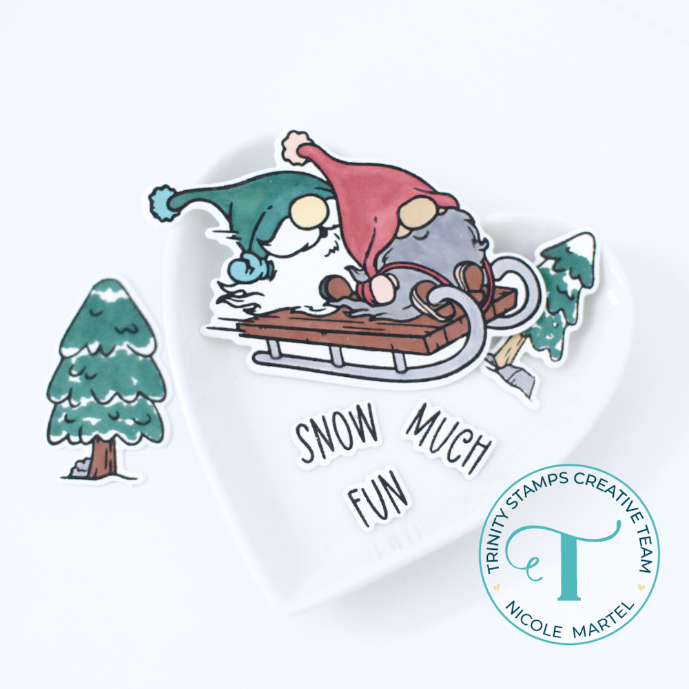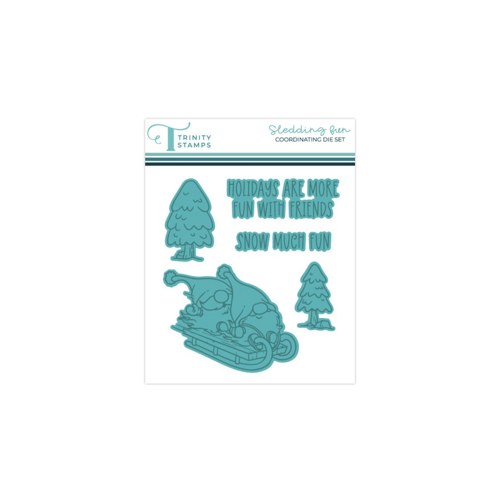 The Trinity Stamps Sledding Fun Die Set is a 5-piece die set designed to perfectly cut out all the images from the coordinating 4 x 4 inch Sledding Fun stamp set (sold separately). This set ensures clean, precise cuts for creating playful winter scenes.