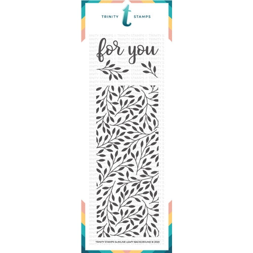 A perfect background for your slimline cards. This 4 x 11 inch slimline stamp set features one large slimline leafy pattern background stamp that measures 8.25 x 3.25 inches, as well as 4 supporting stamps including scripty 'for' and 'you' sentiment stamps (roughly 0.98 inch tall) and two additional leafy branch stamps (largest one measures 1.57 x 1.18 inches).