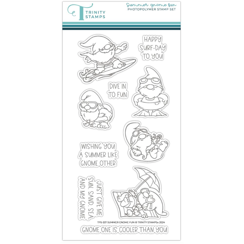 Add some fun to your summer cards with the Trinity Stamps Summer Gnome Fun Clear Stamp Set! This delightful 4 x 8 inch stamp set includes 10 pieces featuring adorable gnomes enjoying the sun, paired with punny sentiments for a playful touch. Sentiments include,