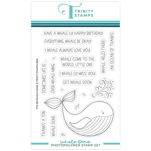 Whale Done is a 19 piece 4 x 6 inch clear stamp set featuring a large whale with mix and match sentiments and splashes to create a whale-y great card! Whale image measures approximately 3.6 x 2.4 inches.