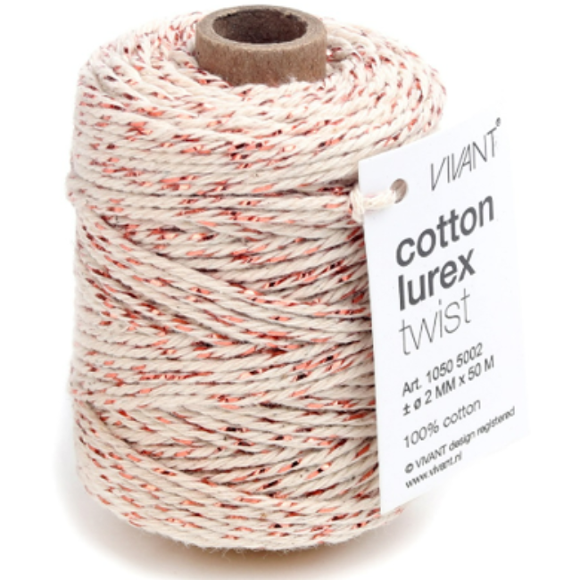 Lurex Red and Rose Gold Cotton Cord, crafted by Vivant, stands as a versatile and stylish crafting material poised to introduce a touch of sophistication into your projects. Encased within this spool, you'll find a generous 54.68 yards of cotton thread, enriched with metallic lurex, combining chic rose gold and cream hues. Comprising 70% Cotton and 30% Lurex, it offers a harmonious blend of quality and sheen for your creative endeavors.