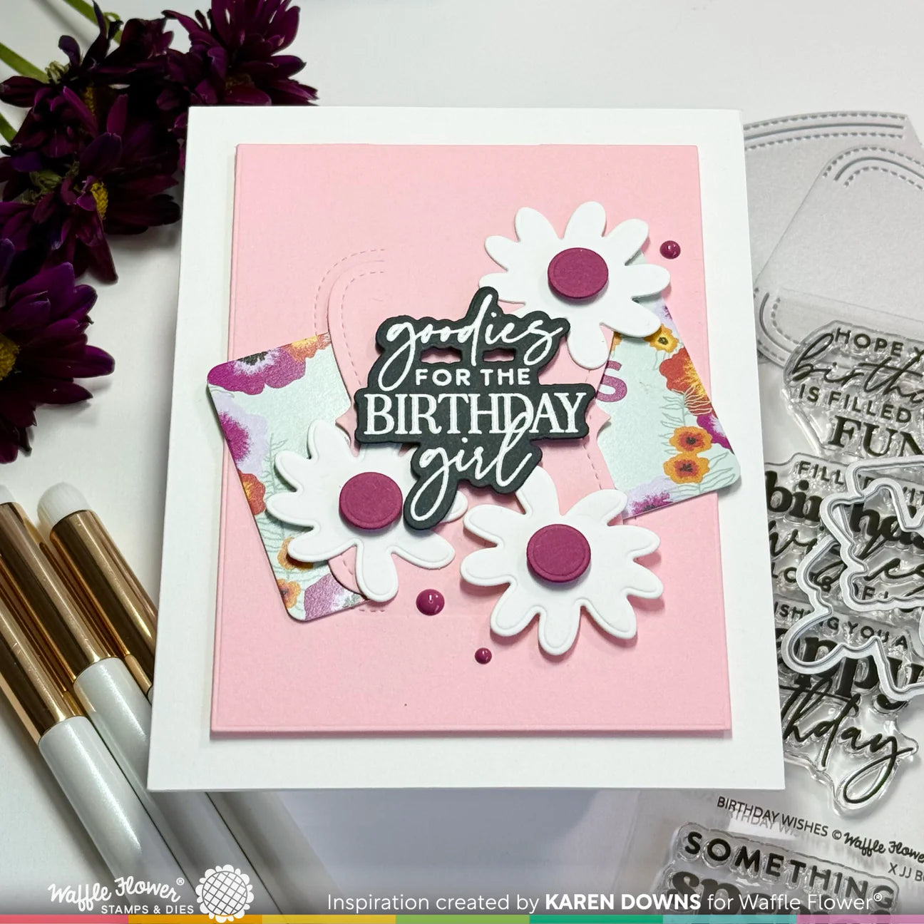 The Waffle Flower Birthday Wishes Matching Dies include 8 high-quality dies designed to coordinate with the sentiments in the Birthday Wishes Clear Stamps 421721, sold separately. These dies ensure clean, precise cuts, making it easy to add dimension and polish to your birthday-themed projects.