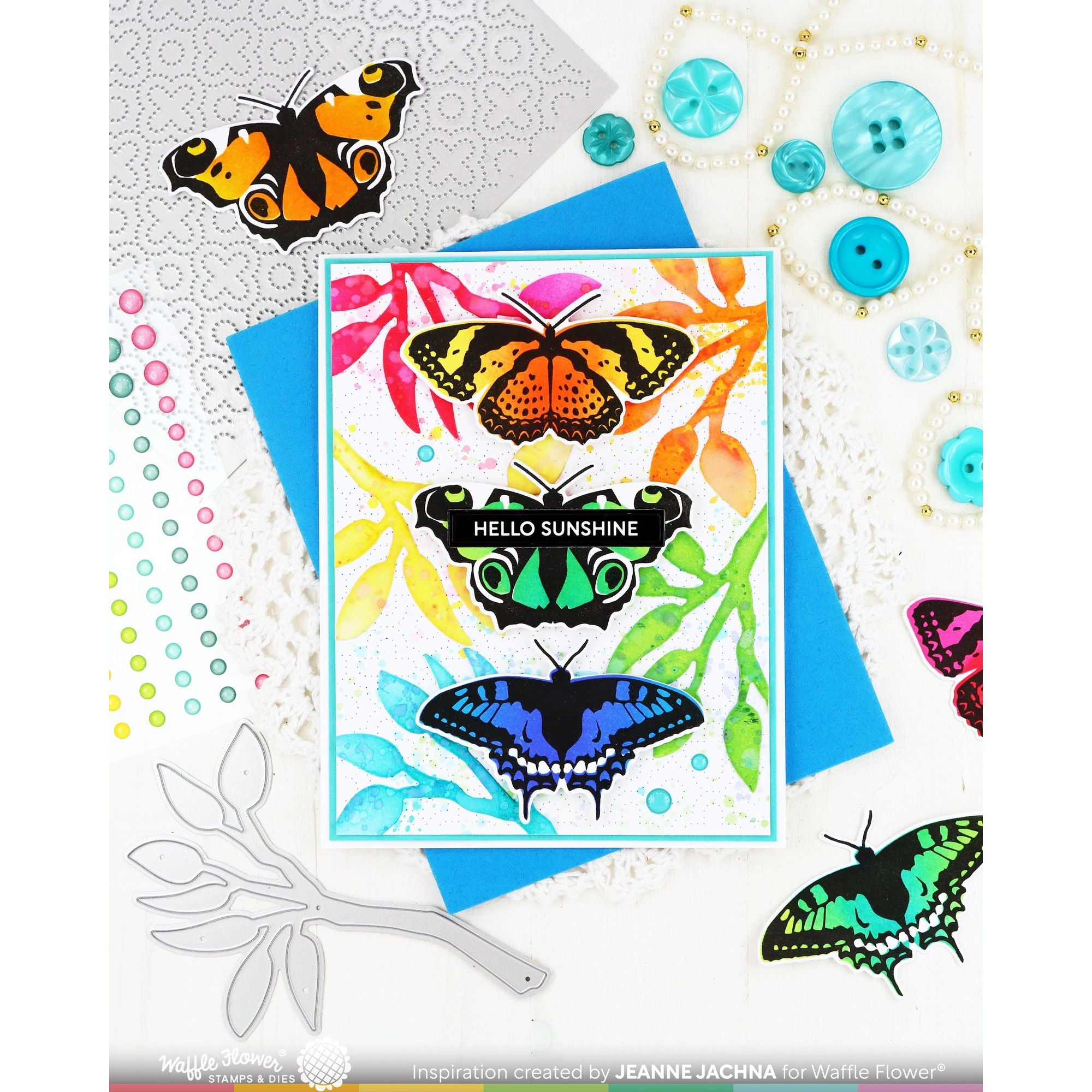 Waffle Flower Butterfly Trio Clear Stamps is a 4x6 inch set that includes detailed outline layers for three butterflies, perfect for adding definition and depth. Use a stamp positioner to align the outlines over ink-blended butterflies or to guide stencil placement.