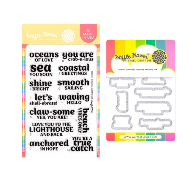 The Waffle Flower Coastal Greetings Clear Stamp and Die Set includes the 4 x 6 inch Coastal Greetings Clear Stamps 422073 with 13 playful and heartwarming sentiments. Along with the Coastal Greetings Piercing Matching Dies 422074, which has 13 coordinating outline dies. Designed to pair perfectly with Waffle Flower’s coastal-themed images, this set is ideal for adding a sweet, lighthearted touch to cards for friends and family. The matching dies feature a piercing detail around each sentiment, offering a polished finish with added texture, perfect for beachy, fun, and informal cardmaking projects.