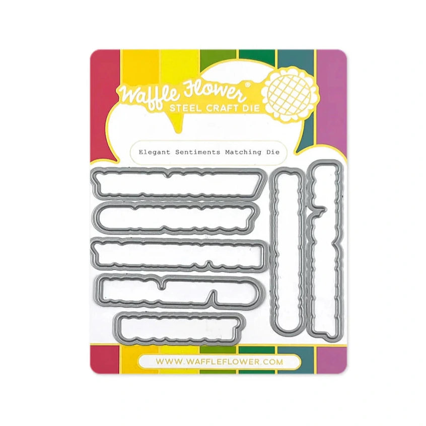 The Waffle Flower Elegant Sentiments Dies are designed to coordinate with the Elegant Sentiments Clear Stamps 420951, sold separately. This set includes 7 dies that precisely cut out each sentiment from the stamp set. Compatible with all leading desktop die-cutting machines, these dies add polished dimension to your cards, tags, and paper crafts.
