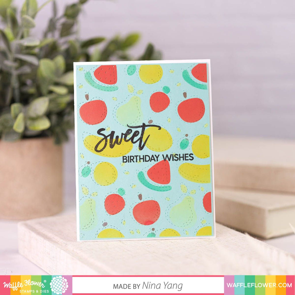 Using all three layers together, you can color the entire panel of the Fruity Background Foil Plate and Fruity Texture Die. However, you have the flexibility to ink blend just one layer or mix and match the shapes to create a customized background. The Fruity Stamp Set can be used to stamp the outlines, and there's no need to be exact, allowing for a playful and fun approach to your crafting.