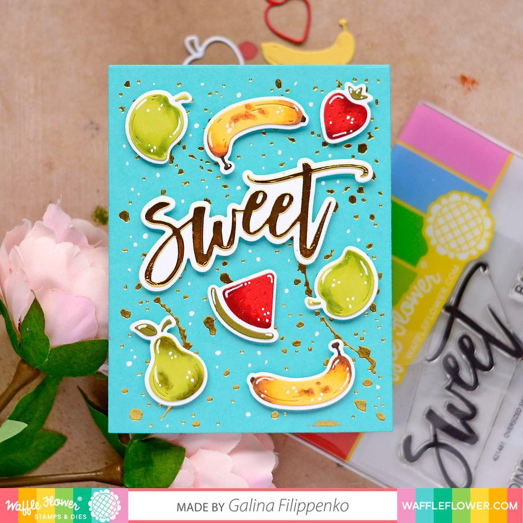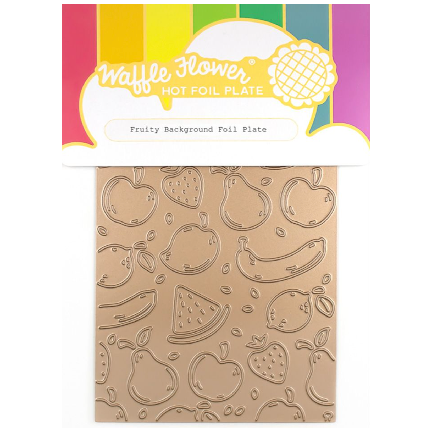 The Waffle Flower Fruity Background Hot Foil Plate offers a contemporary twist on the fruity theme. When used in conjunction with the Fruity Background coloring stencil, it creates a stunning and modern design. The combination of the hot foiled details with abstract color blocks is a perfect pairing, providing a delightful and artistic touch to your projects.