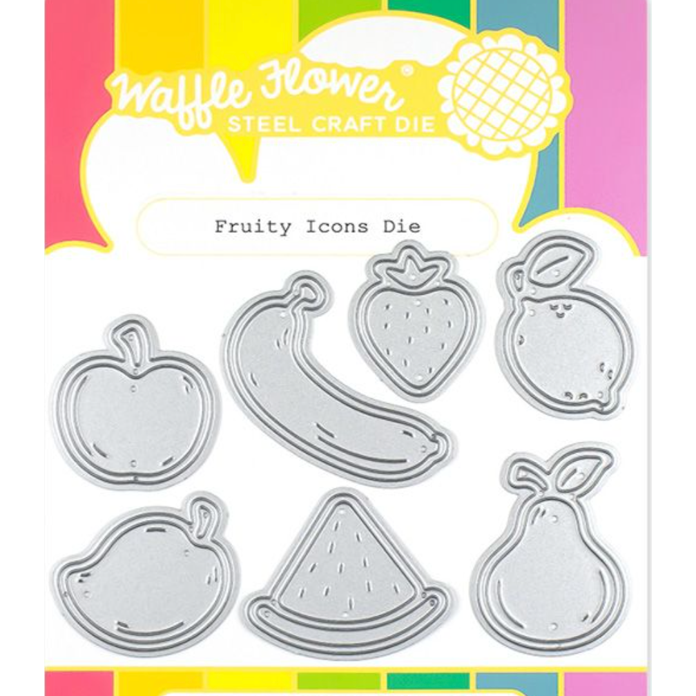The Waffle Flower Fruity Icons Dies are designed to coordinate with the 7 sweet fruits included in the Fruity Stamp Set. These dies are the die-cutting version of the stamped fruit images, allowing you to easily cut them out and add dimension to your projects. It's worth noting that the matching dies for the Fruity Stamp Set serve as bases for these dies, providing a seamless combination for your crafting needs.