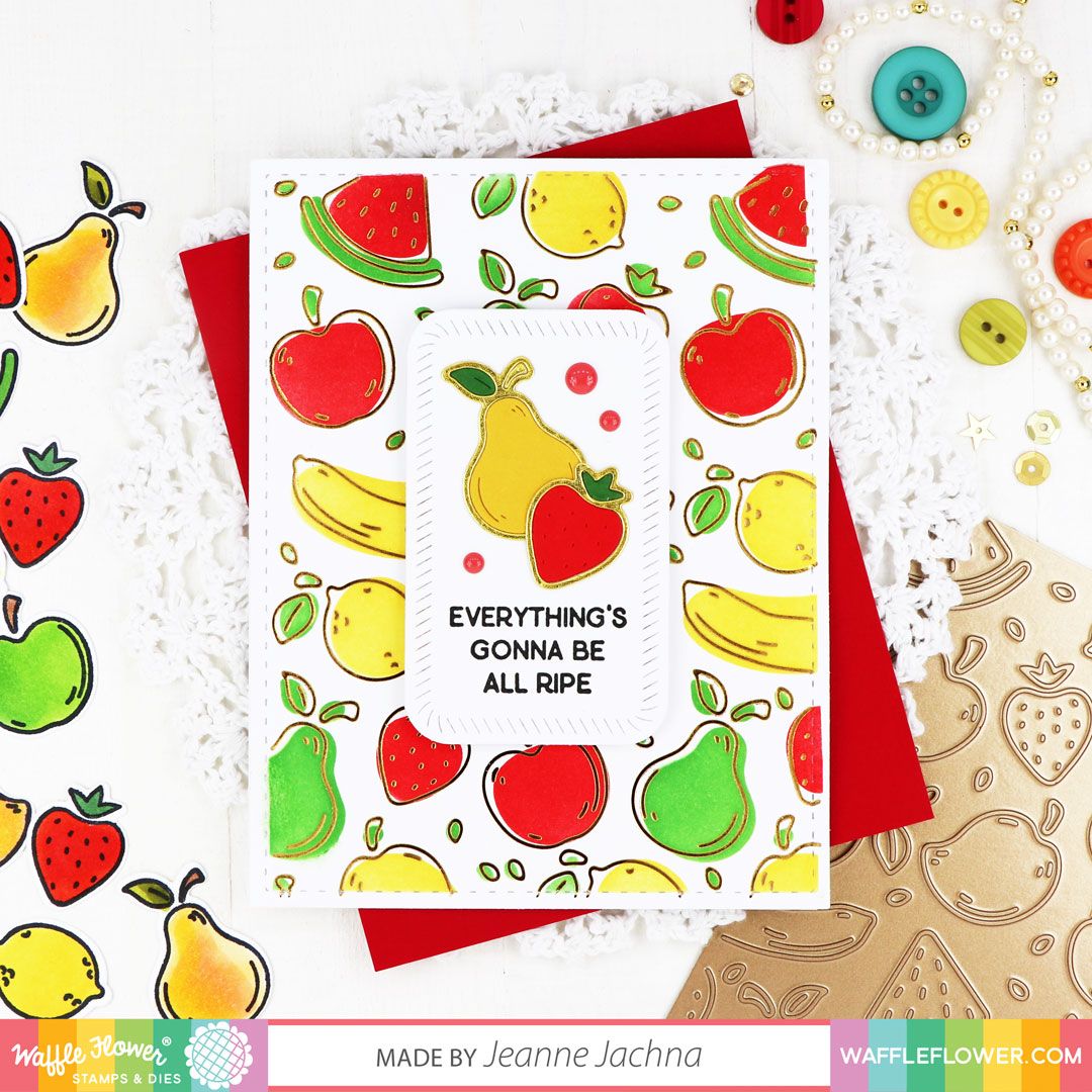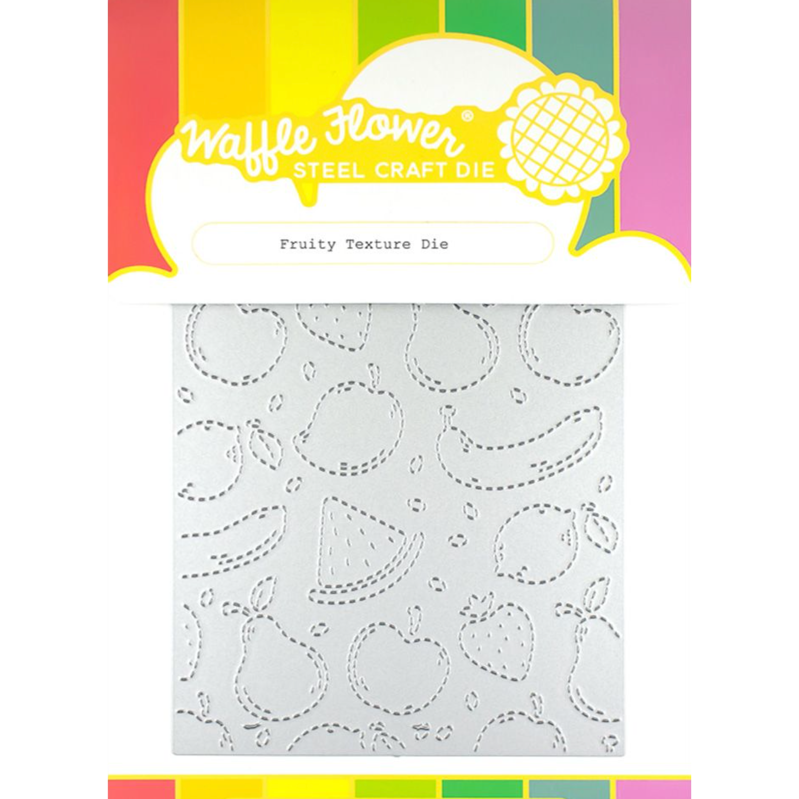 The Waffle Flower Fruity Texture Die is a textured version of the playful Fruity Background foil plate version. This die allows you to create a fun and modern background for your cards, especially when used with the Fruity Background Coloring Stencil.