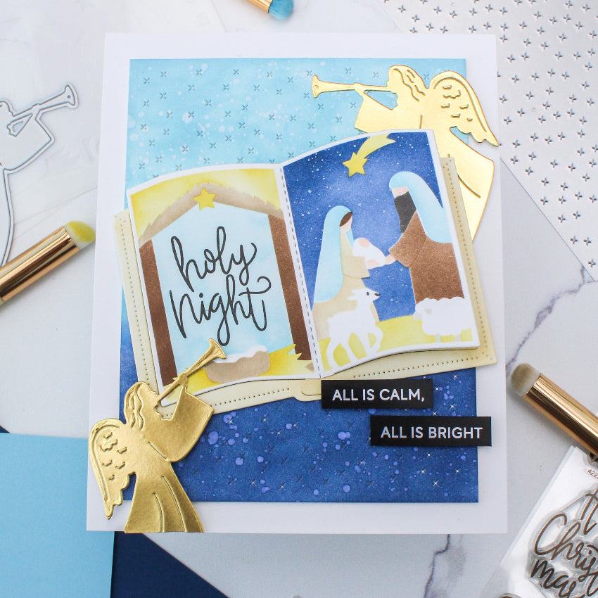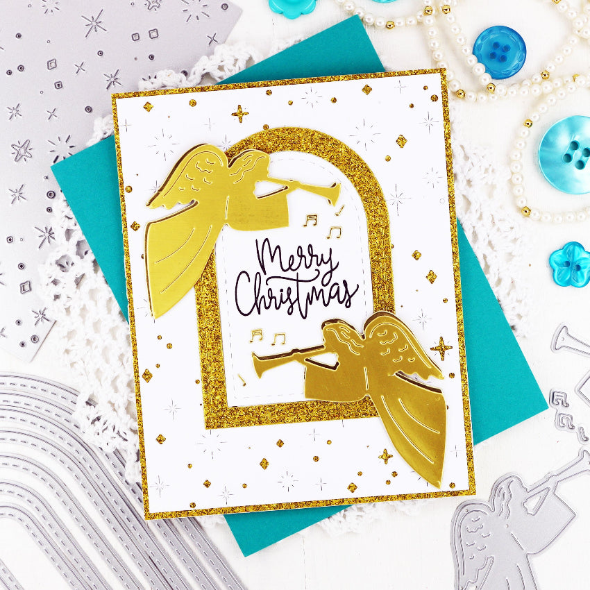 Waffle Flower Glory Angel Dies includes two trumpet-playing angel silhouettes in mirrored poses, ideal for framing a focal point or creating balance in your design. These elegant accents add a peaceful, refined touch to holiday cards and festive projects. The set also includes two small musical note dies for extra charm. Set of 3 dies. Approximate sizes: angels measure 2.44 x 2.31 inches, single musical note is 0.13 x 0.19 inches, and double musical note is 0.19 x 0.19 inches.