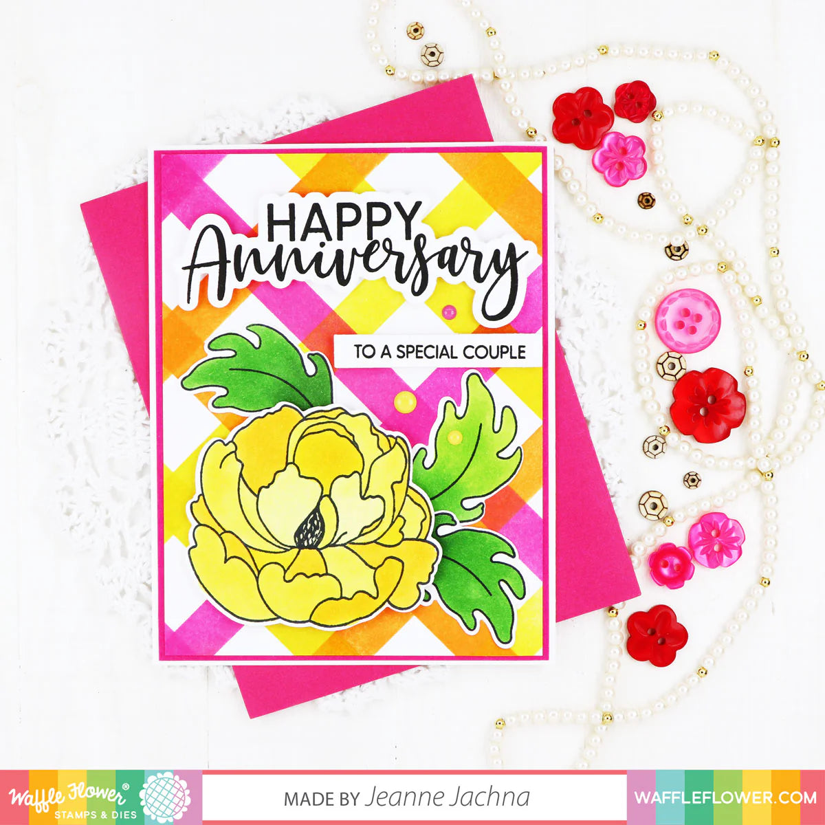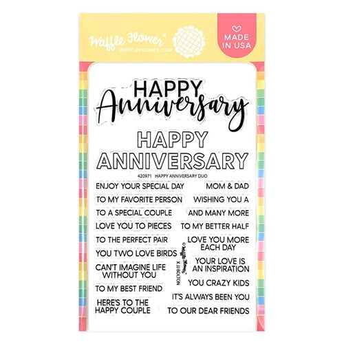Waffle Flower Happy Anniversary Duo Clear Stamp Set, designed by cardmaker JJ Bolton, is a 4 x 6 inch photopolymer set featuring 20 stamps. It includes two bold Happy Anniversary focal sentiments in different font styles to suit a range of card designs. A variety of coordinating sub-sentiments let you personalize your message for your significant other or a special couple. Coordinating Happy Anniversary Duo Dies 420972 are sold separately.