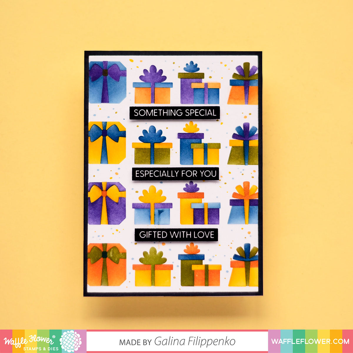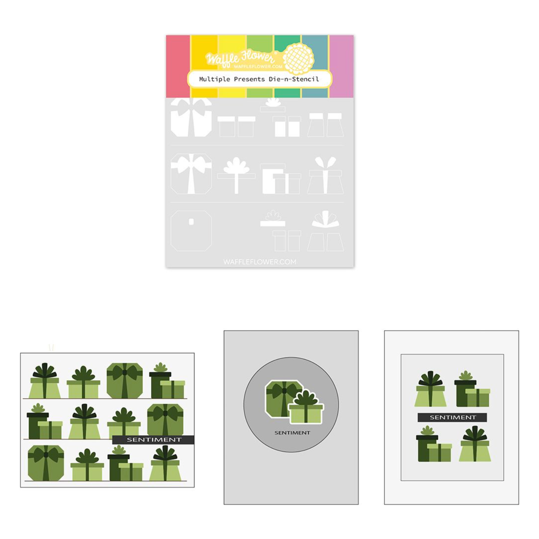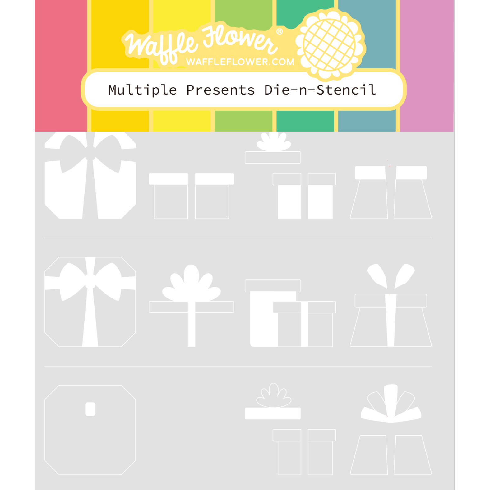Waffle Flower Multiple Presents Die-n-stencil Bring a touch of charm to your projects with the Multiple Presents Die-n-stencil set. This innovative set allows you to easily create four different presents using a single stencil. Simply stencil in one color along the lines and then move the stencil up and down to complete the remaining color layers.