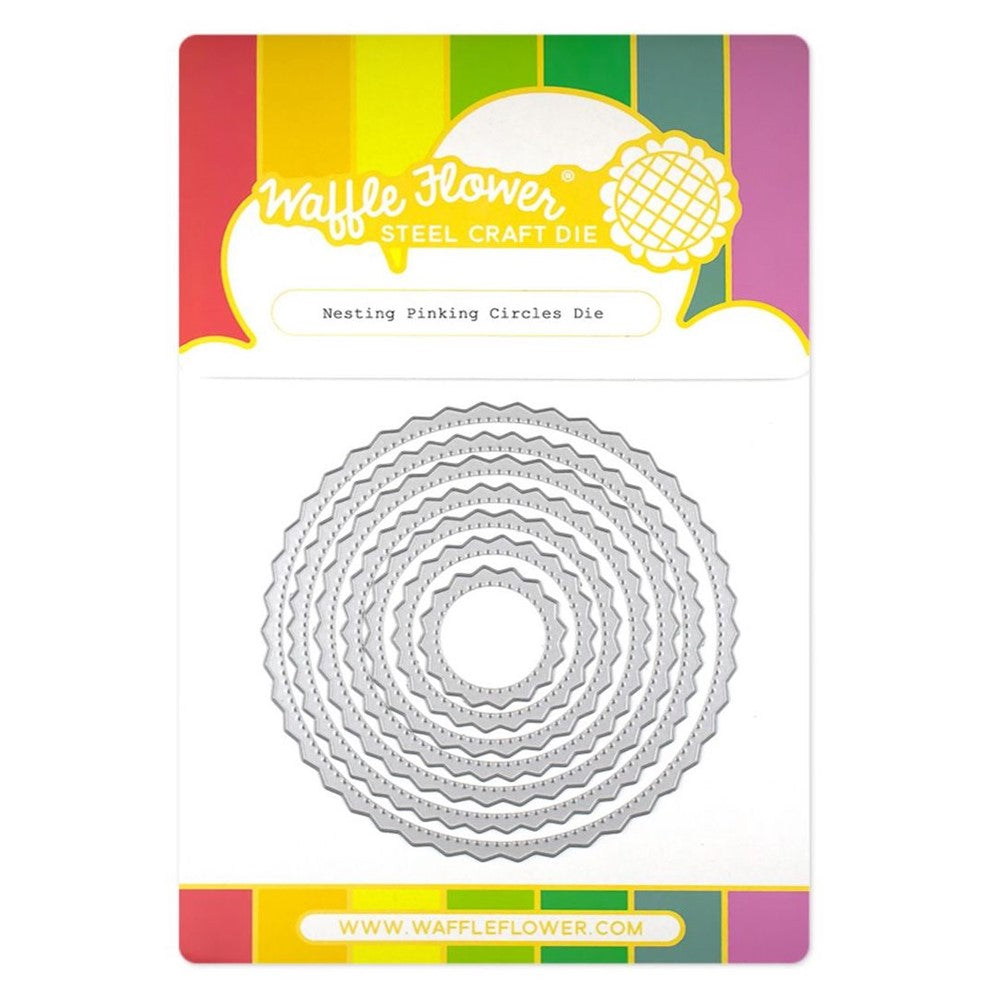 The Waffle Flower Nesting Pinking Circles Dies are a set of seven circle dies that feature zigzagged edges and dotted details. These dies are perfect for creating unique and eye-catching designs for your crafting projects. Try using these dies to cut out windows for a different look.