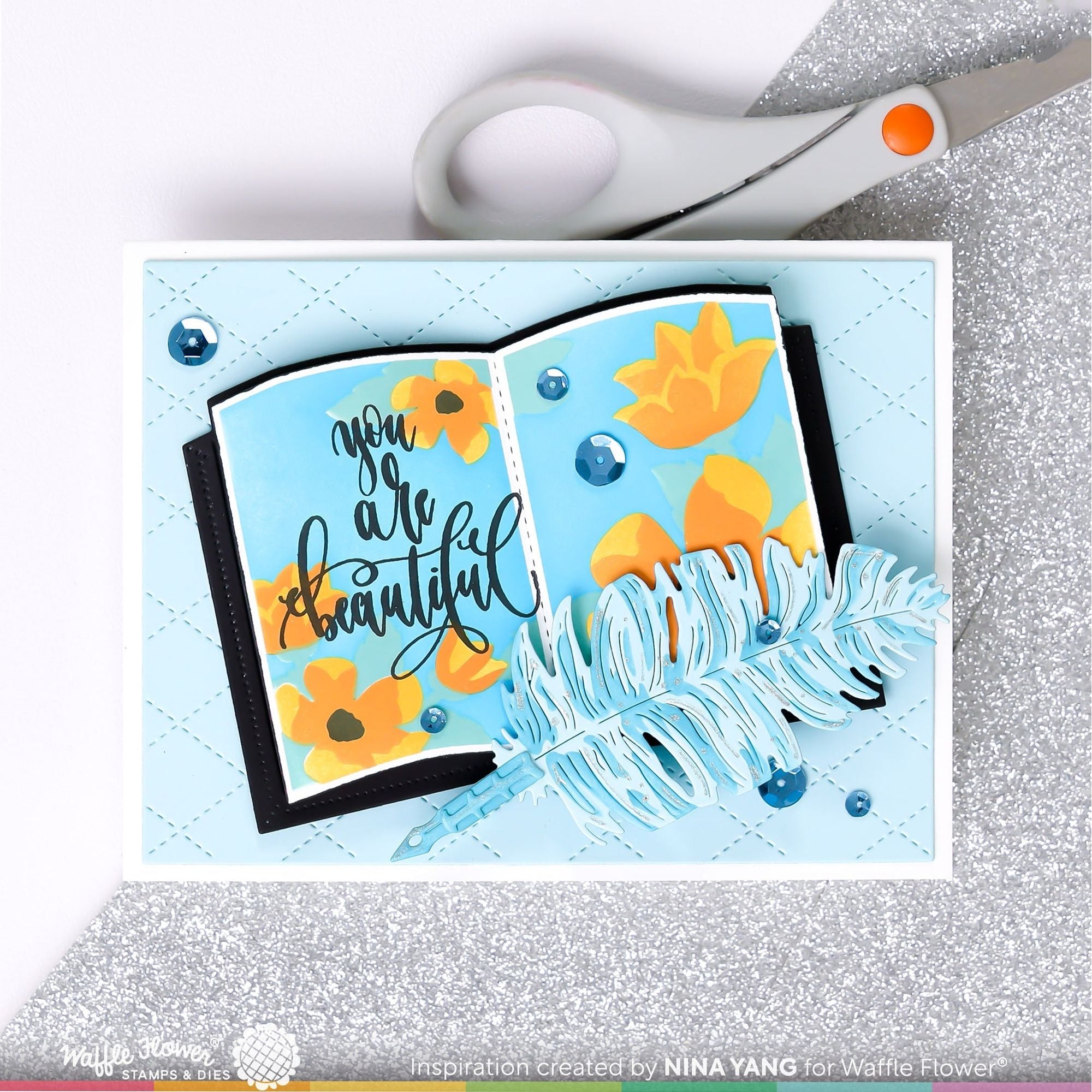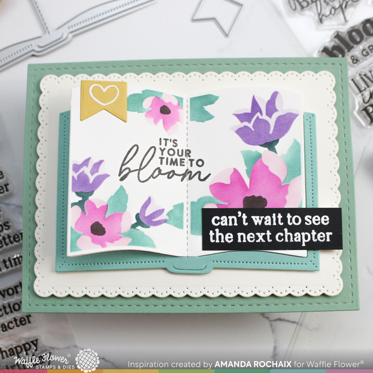 The Waffle Flower Open Book Floral Stencils add a charming floral touch to your projects, perfectly designed to complement the Open Book Die. This layering stencil set spans both pages of the book, uniting your spread with a botanical backdrop ideal for pairing with sentiments and decorative elements.