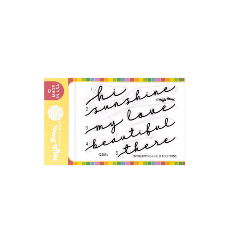 The Waffle Flower Overlapping Hello Additions Clear Stamps is a 3 x 4 inch set featuring five elegant script sentiments, perfect for pairing with the Overlapping Hello Die-n-Stencil 422101 or any design in the Overlapping series. These versatile sentiments are ideal for adding a polished finishing touch to your cards and layered greetings. For added dimension and convenience, use with the coordinating Overlapping Hello Additions Matching Dies 422092, sold separately.