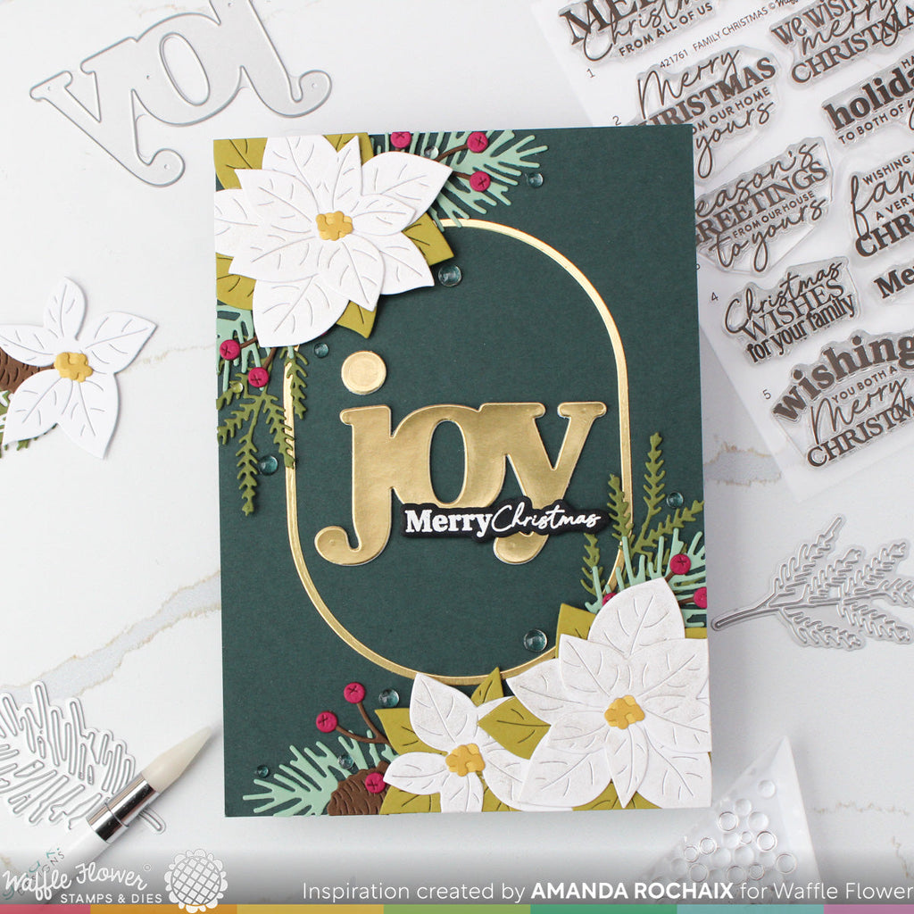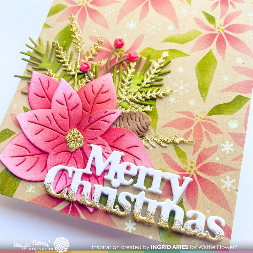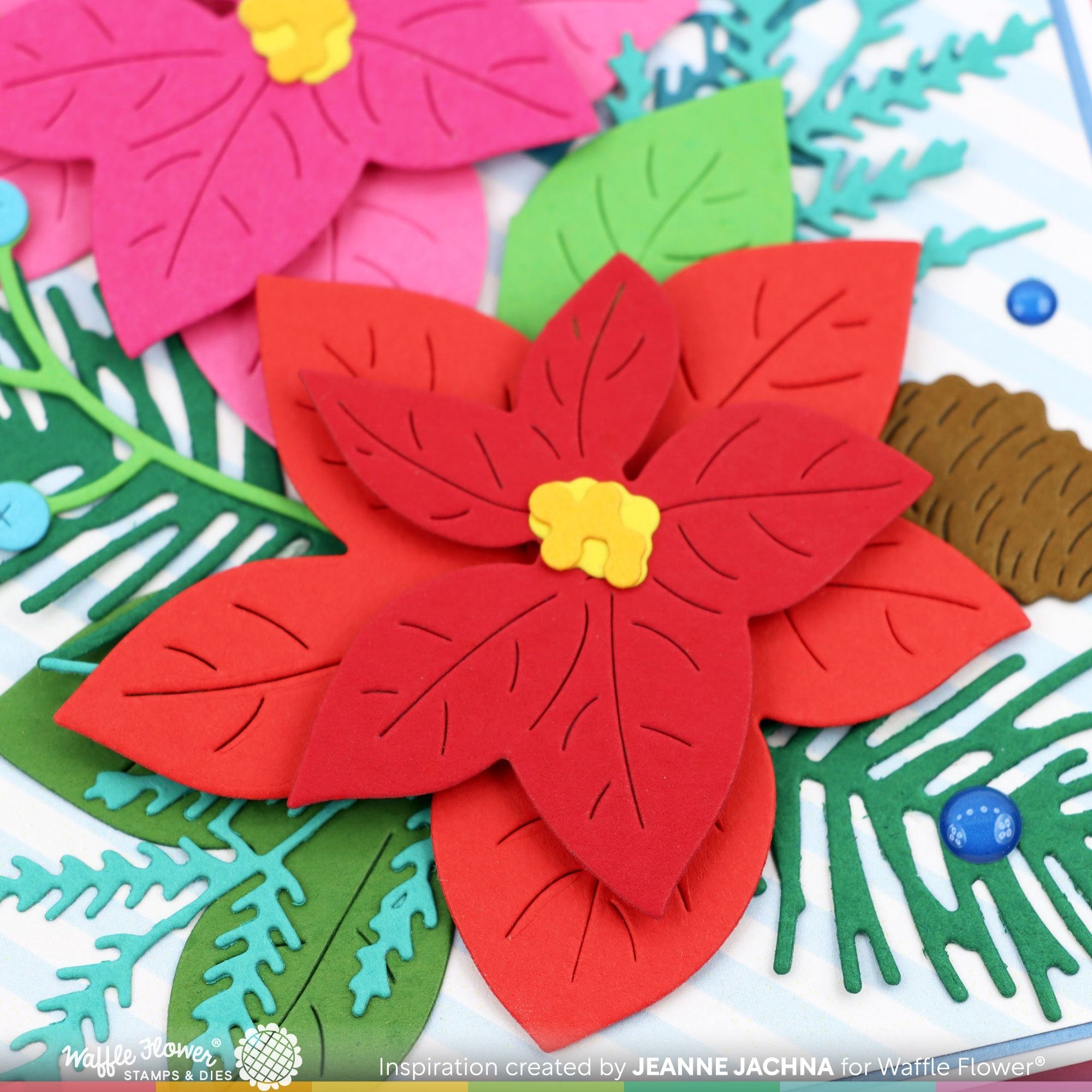 Create a holiday spray with the Poinsettia Cluster Die set. This set contains classic holiday icons, including a large poinsettia, sprigs of fir, holly berries, and even a pinecone. The largest layer of the poinsettia also serves as leaves—just rotate to offset the leaves and petals cut out from the same die, as shown in our demo video.