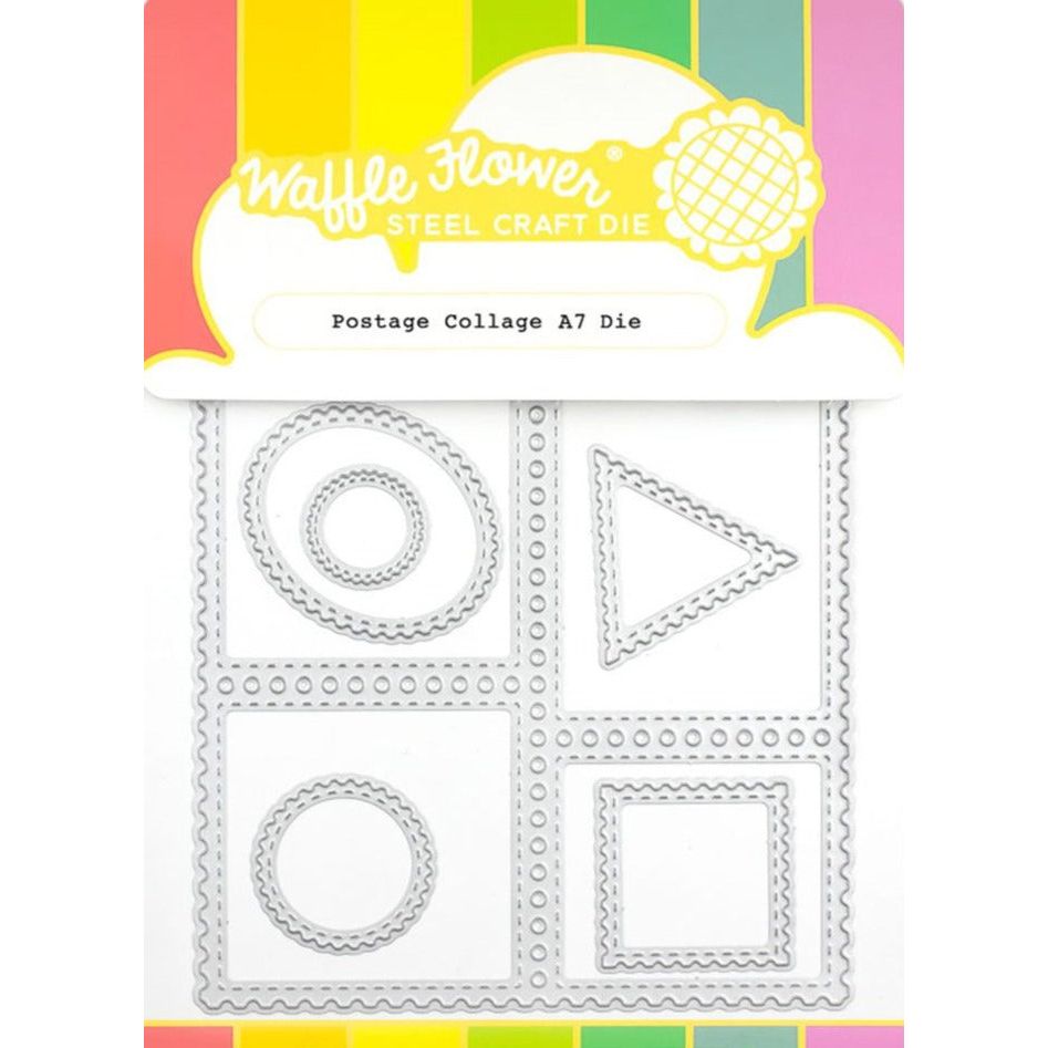The Waffle Flower Postage Collage A7 Dies includes five individual postage stamp outline shapes with varied designs, along with a full A7 sized panel of postage stamp shapes that can be easily trimmed apart. Use the dies on their own or pair them with other products from the Postage Collage Collection. Coordinates perfectly with the Postage Collage A7 Blocks Dies 421947, sold separately.