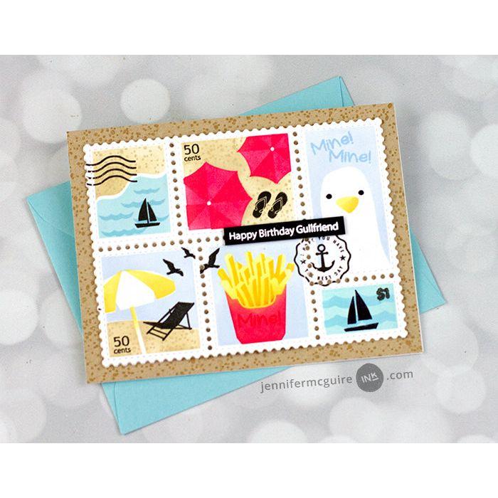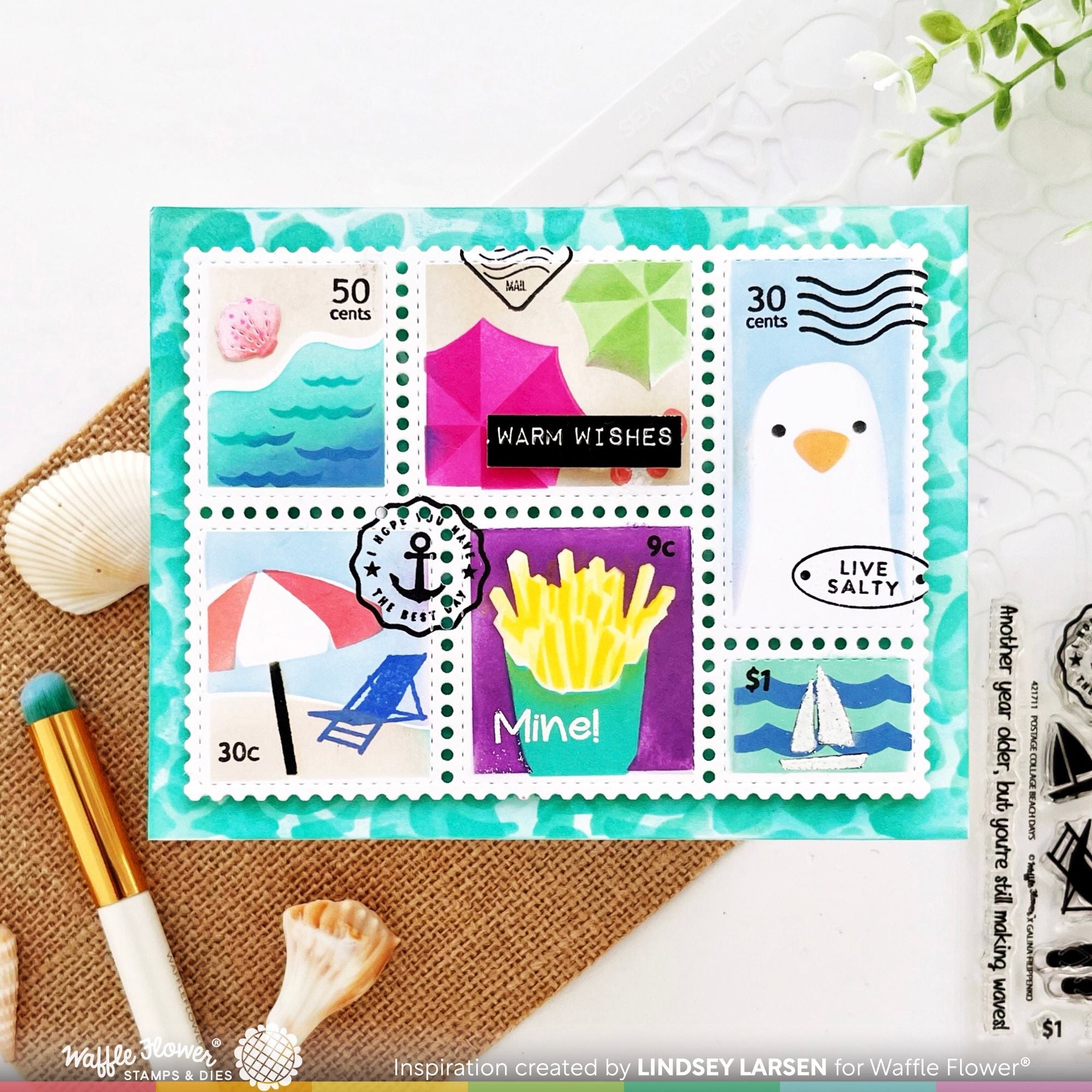 The Waffle Flower Postage Collage Beach Days Clear Stamps serve as a detailed complement to the Postage Collage Beach Days Stencil.