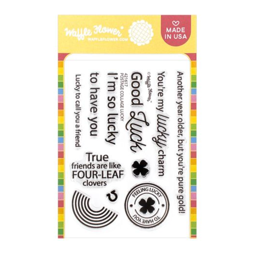 The Waffle Flower Postage Collage Lucky Clear Stamps is a stamp 3 x 4 inch set designed to complement your luck-themed Postage Collage projects. Here are the key features of this stamp set: