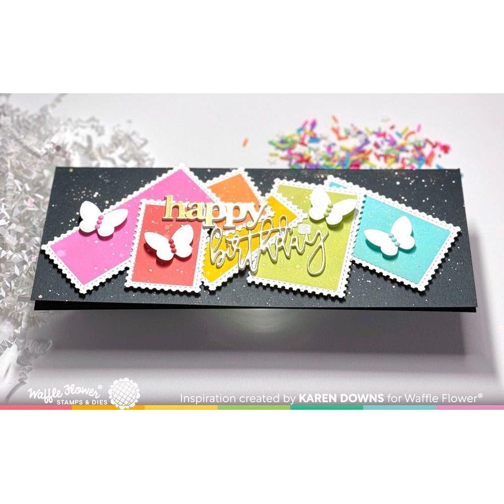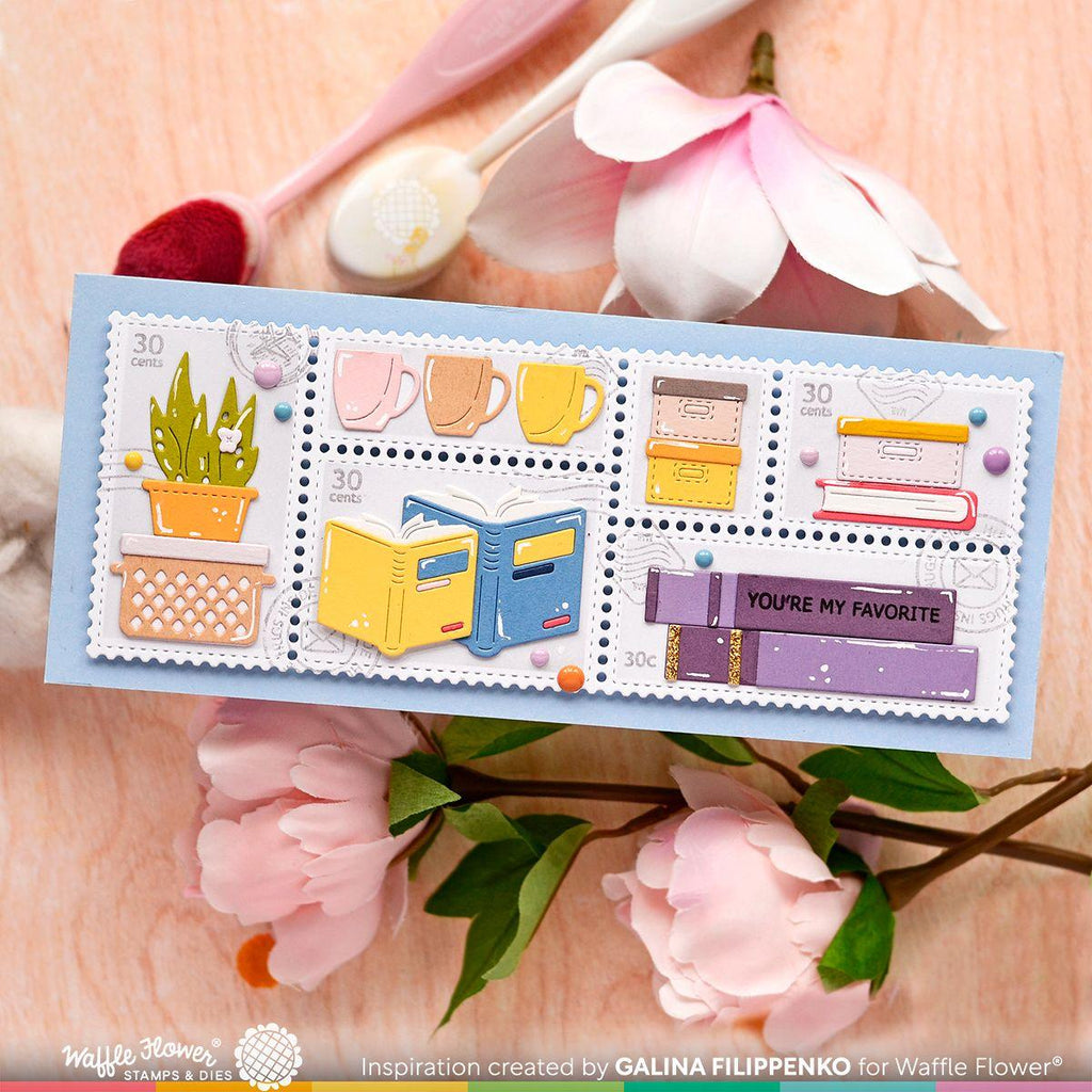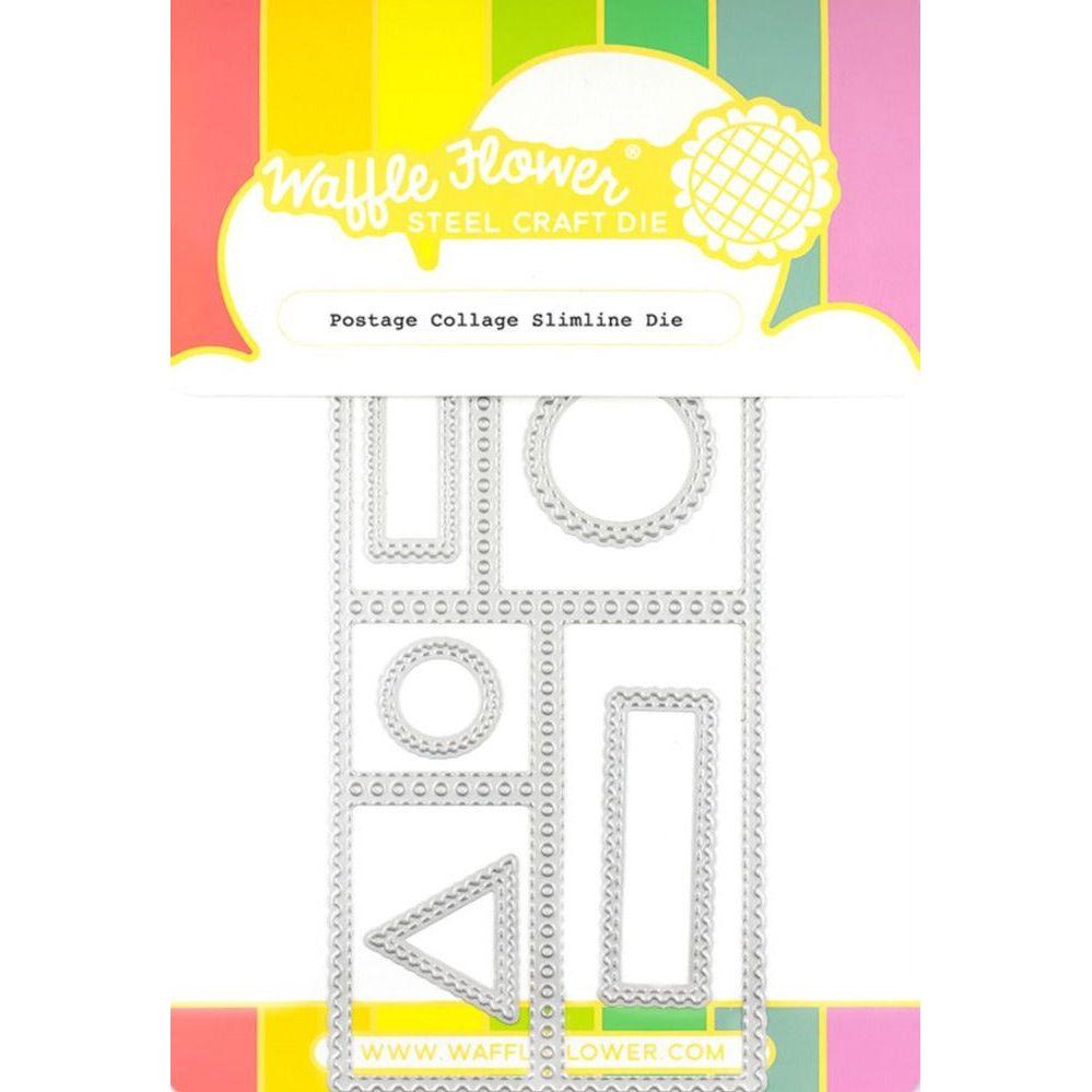 The Waffle Flower Postage Collage Slimline Dies include individual postage stamp outline shapes with varied designs, along with a full slimline-sized panel of postage stamp shapes that can be easily trimmed apart. These versatile dies can be used on their own or paired with other products from the Postage Collage Collection.