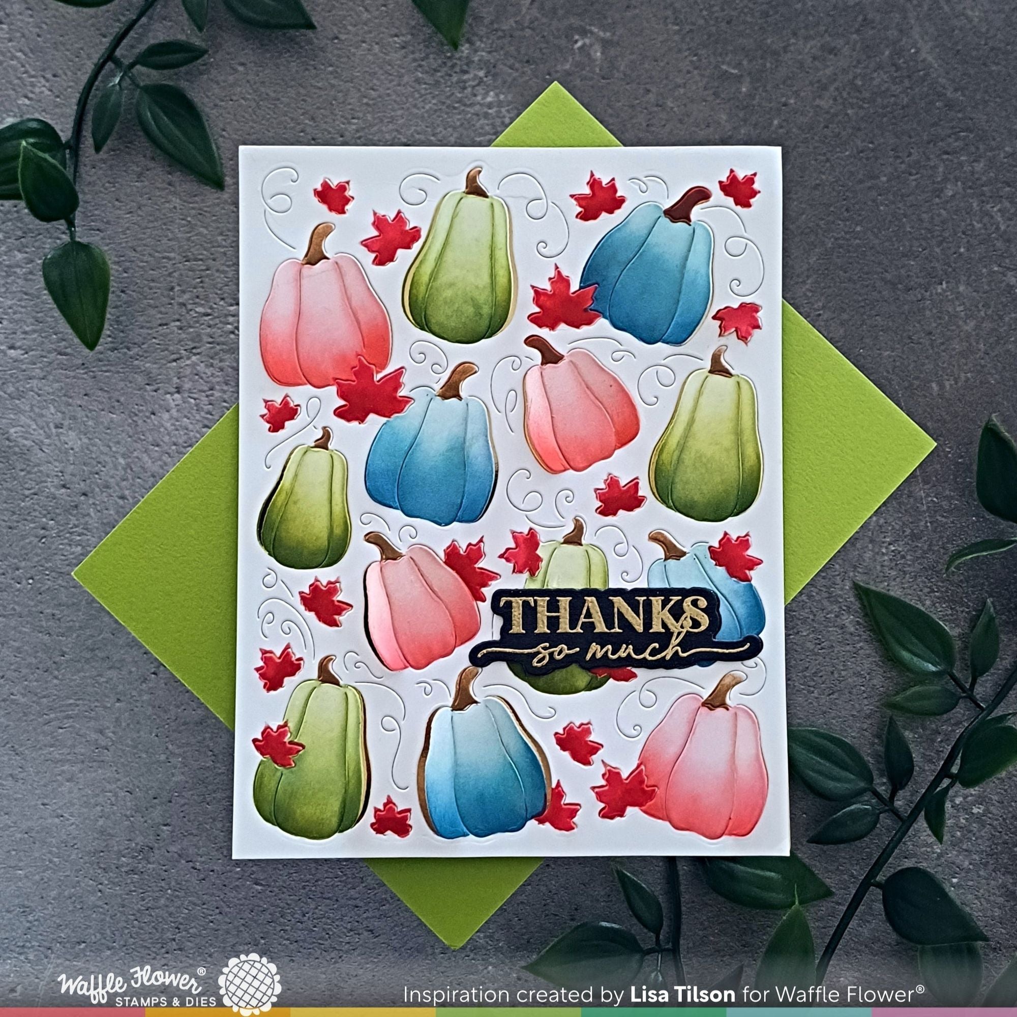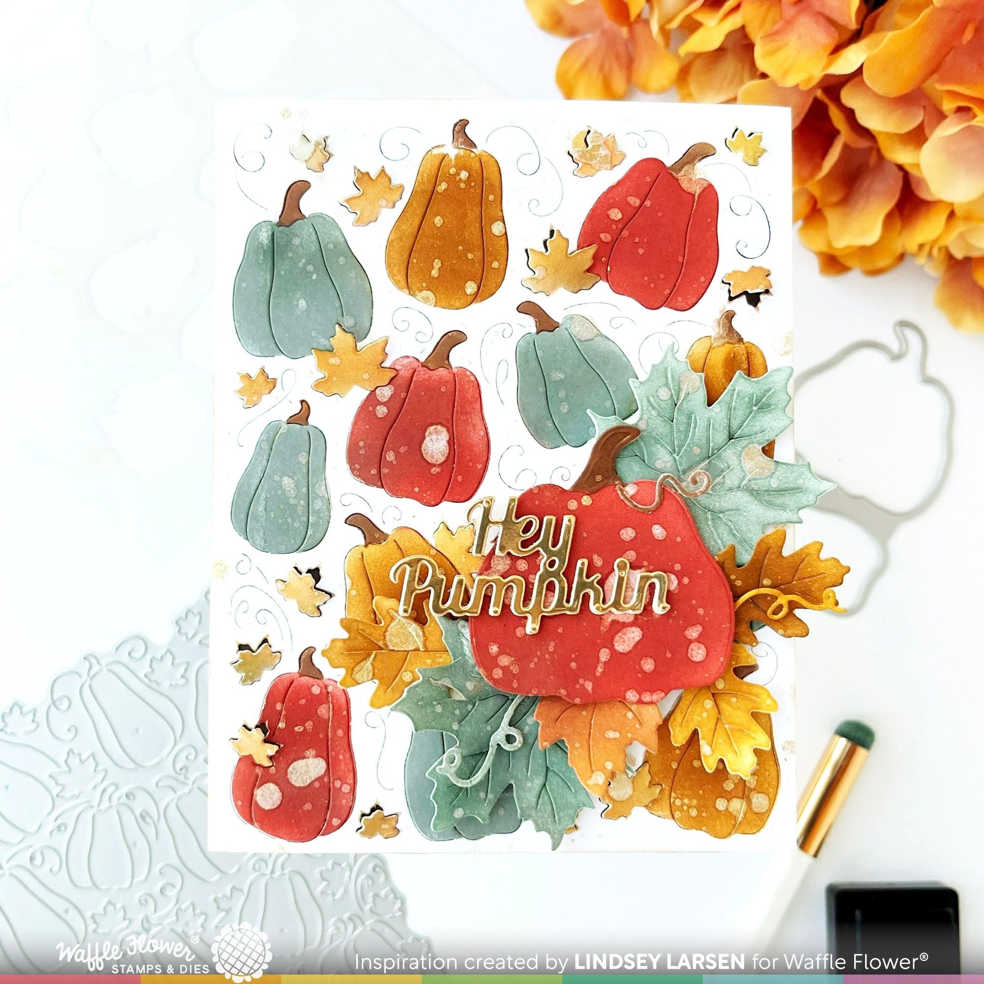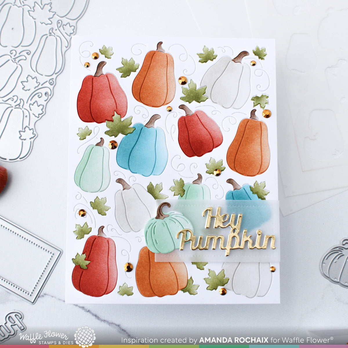 The Pumpkin Patch Panel Die showcases a partial-cut design with pumpkins in various shapes and sizes. The die includes swirl details and white space, perfect for adding embellishments like gemstones and sequins. You can also trim individual pumpkins to create your own custom clusters. For easy coloring, use the coordinating Pumpkin Patch Coloring Stencil or any coloring medium of your choice.