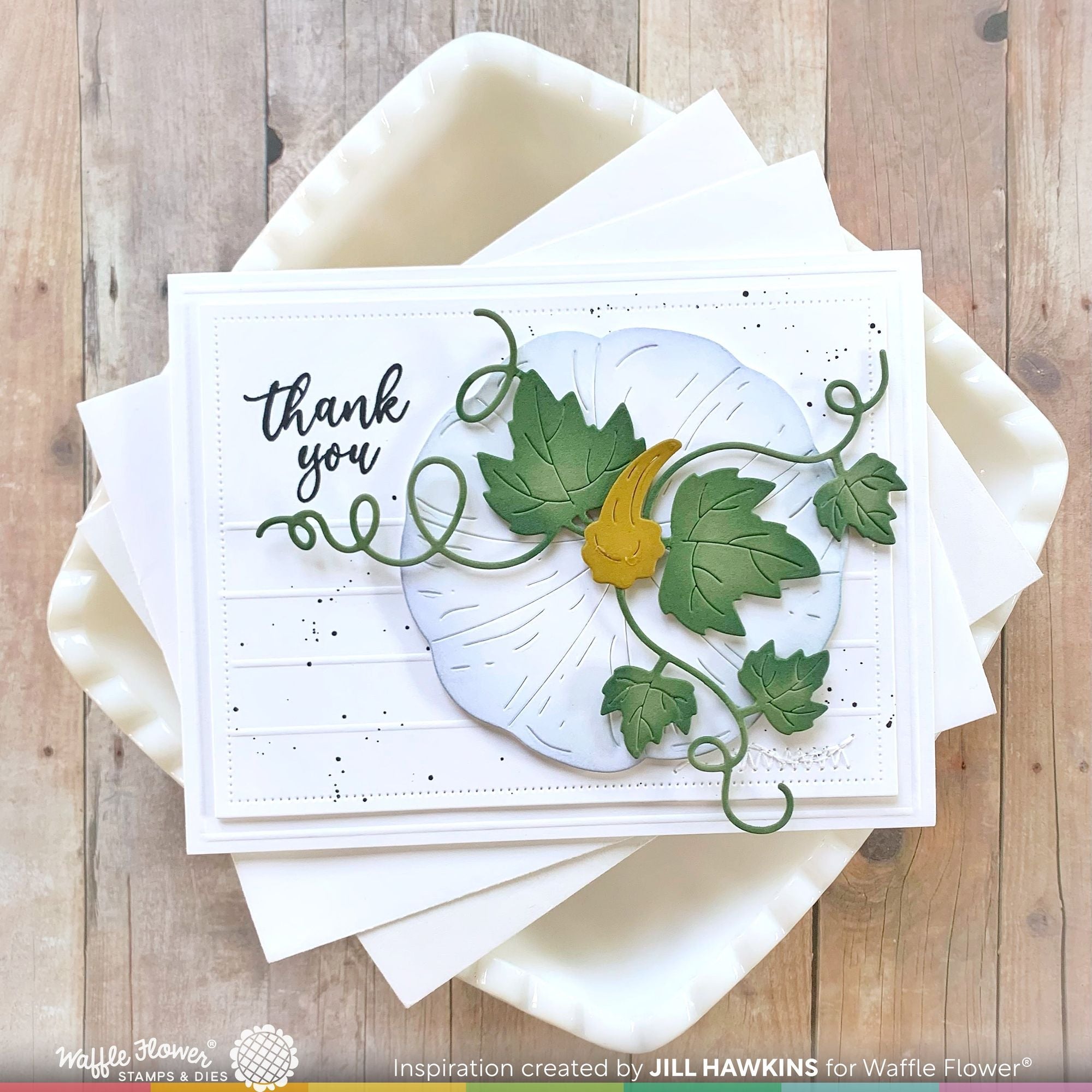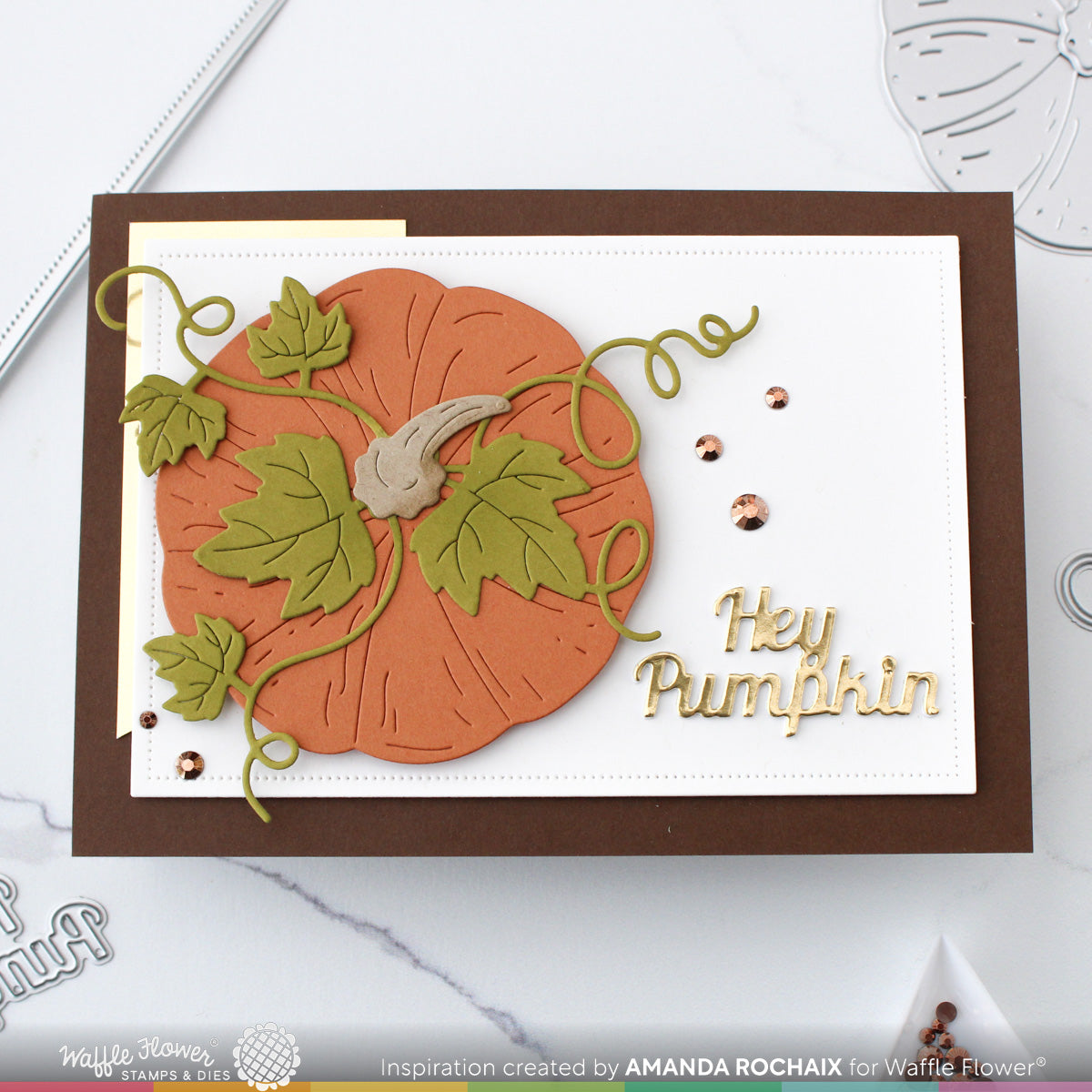 This top-down view of a pumpkin with stems is designed to be the focal point of your card. The detailed cuts allow for easy coloring or leaving uncolored, and the connected stems simplify assembly. For added dimension and visual interest, use foam tape of varying thicknesses under the leaves.