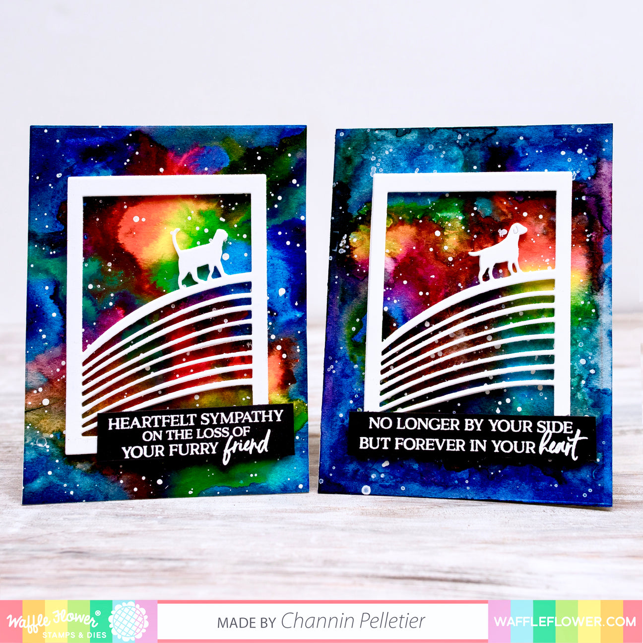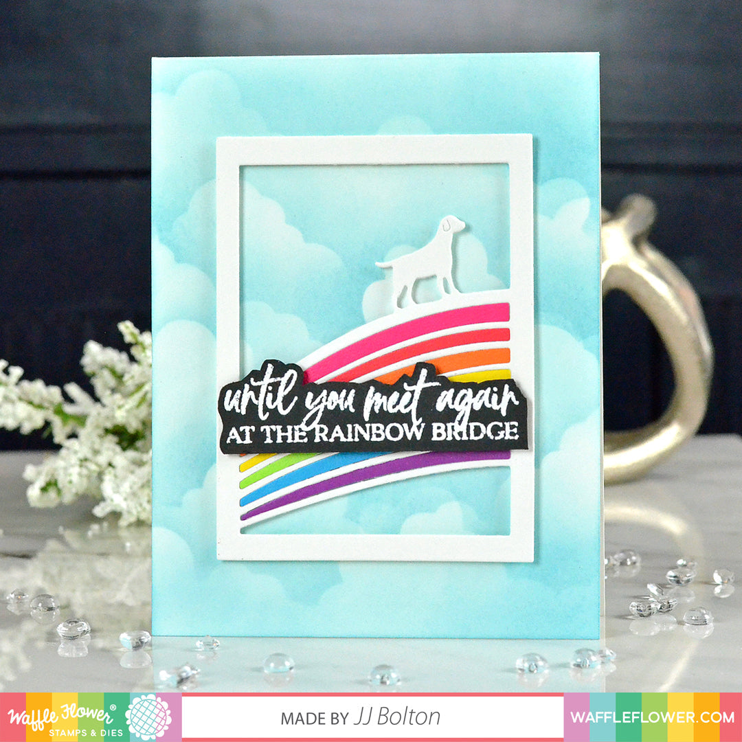 The Waffle Flower Rainbow Bridge Clear Stamps, designed by cardmaker JJ Bolton, offer heartfelt sentiments to comfort those grieving the loss of a beloved pet. Inspired by the story of the Rainbow Bridge, a peaceful place where pets await a joyful reunion with their owners, this 4 x 6 inch set includes 11 photopolymer clear stamps with messages of sympathy and love. These sentiments can be used on their own or paired with the Rainbow Bridge Dog Die 310277 or Rainbow Bridge Cat Die 310278, sold separately.