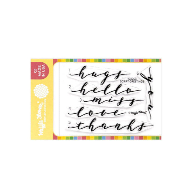 Waffle Flower Script Greetings Clear Stamps is a 3x4 inch set featuring six handwritten-style sentiments, perfect for adding a personal touch to cards, tags, and everyday notes. Coordinates with the Script Greetings Dies 422204, sold separately.