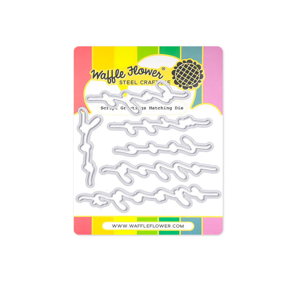 Waffle Flower Script Greetings Matching Dies coordinate with the Script Greetings Clear Stamps 422203, sold separately. This set includes 6 outline dies designed to cut around the stamped sentiments with precision. Compatible with most leading die cutting machines.