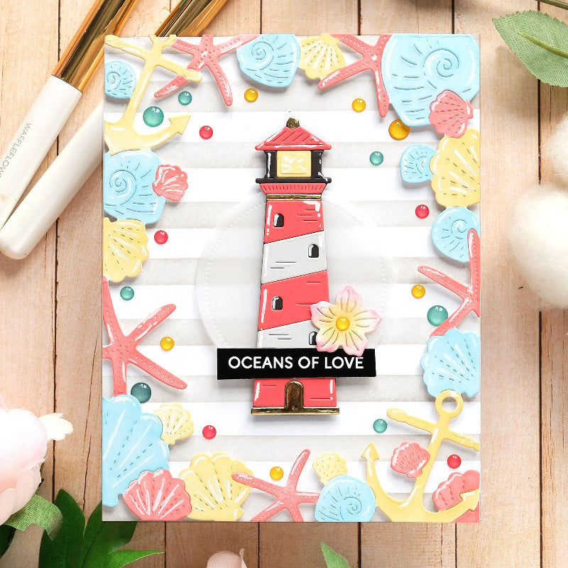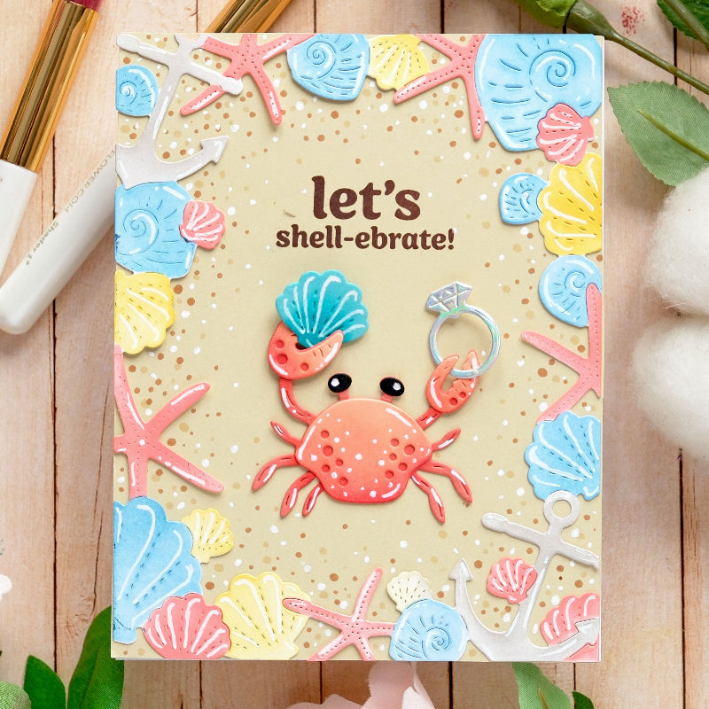 The Waffle Flower Seashell Frame Dies set includes three coordinating dies designed to create a beautifully detailed A2-sized frame. The frame is decorated with an assortment of seashells, snails, sea stars, and anchors, and comes with a separate die for an open oyster shell and a pearl. Perfect for tone-on-tone layering, this set adds elegant dimension when cut from the same cardstock as your card base. It coordinates with the Seashell Frame Coloring Stencils 422087, sold separately, to bring the elements to life with color.