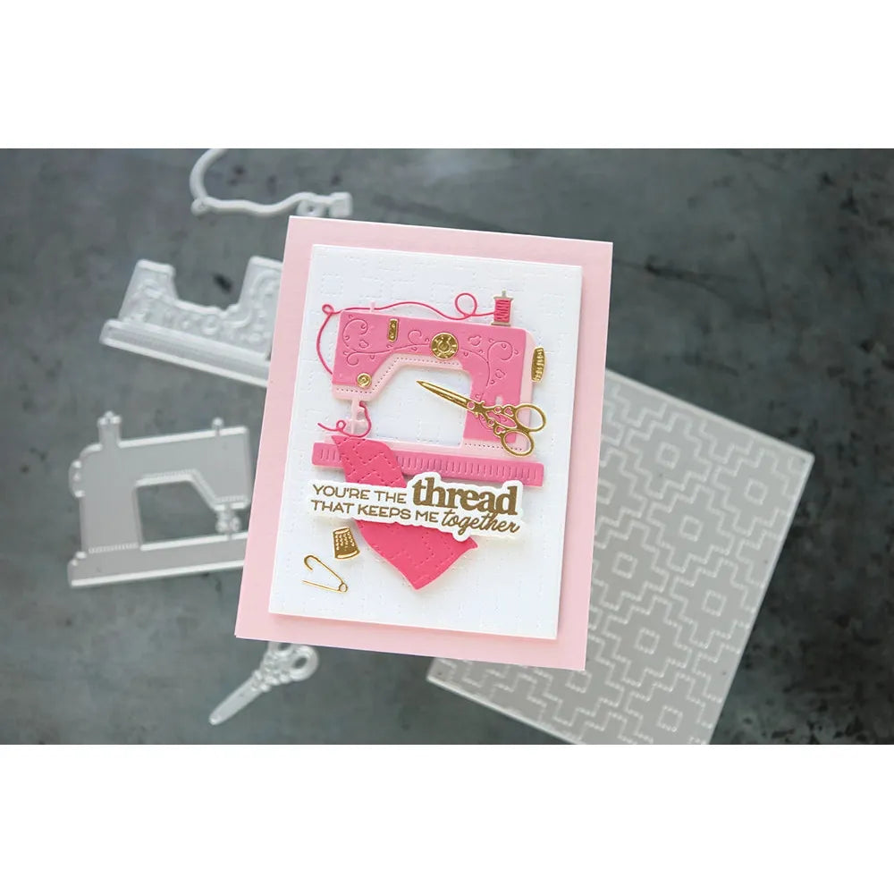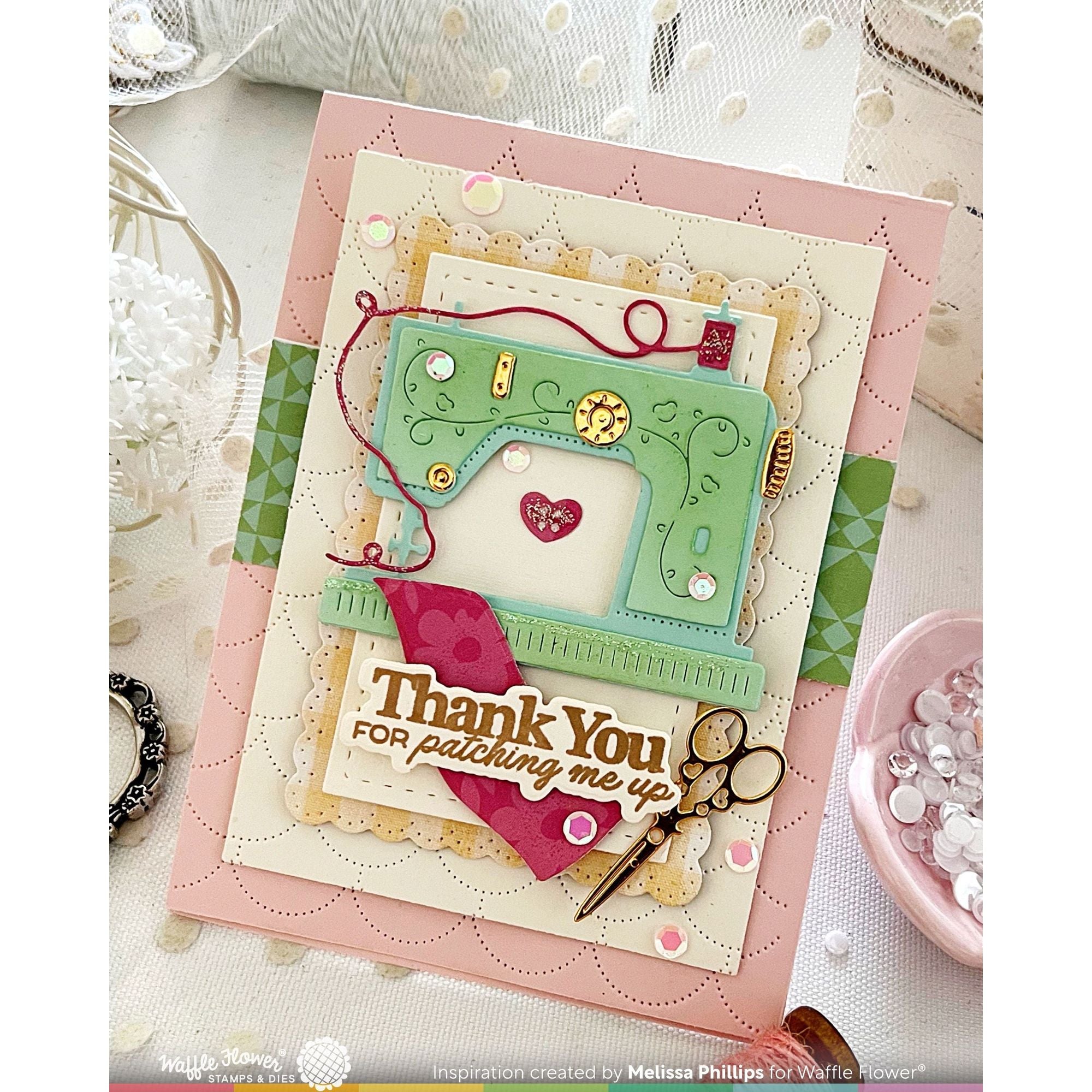 The Waffle Flower Sew Fun Dies set features a charming two-layer sewing machine with floral details, perfect for adding crafty flair to your projects. The set includes labeled knobs and buttons as separate dies, allowing you to cut them from specialty cardstock or add pops of color. It also includes a variety of sewing notionsâlike scissors, a thimble, a safety pin, spools of thread, and a French curve ruler. There is even a draped fabric die, which you can customize with a texture die or sentiment stamp. 12 dies are included in this set.