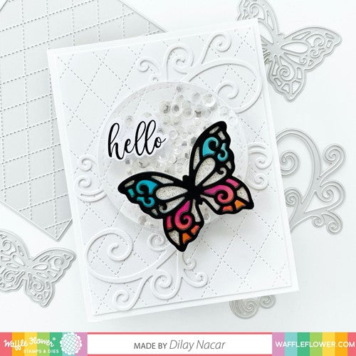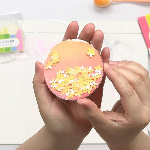 Waffle Flower recommend adding adhesives to the back of your cardstock, then remove protective film on the front of the acetate sheet, and the tabs to the back of the cardstock, leaving 3-4 tabs unfold to form a pocket; fill with confetti, sequins, diecut shapes, and more before sealing the last few tabs.