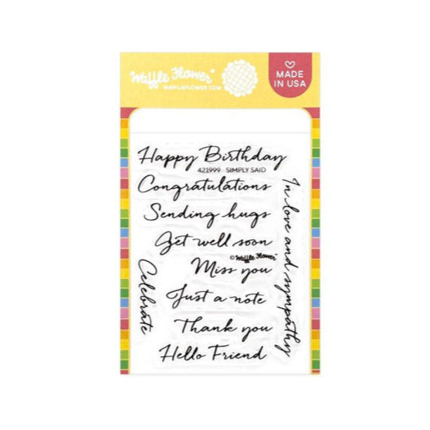 The Waffle Flower Simply Said Clear Stamps is a 3 x 4 inch clear stamp set featuring 10 handwritten script sentiments designed for everyday use. With a clean, modern style, these stamps are versatile and well-suited for a variety of occasions, from birthdays and celebrations to notes of sympathy or encouragement.