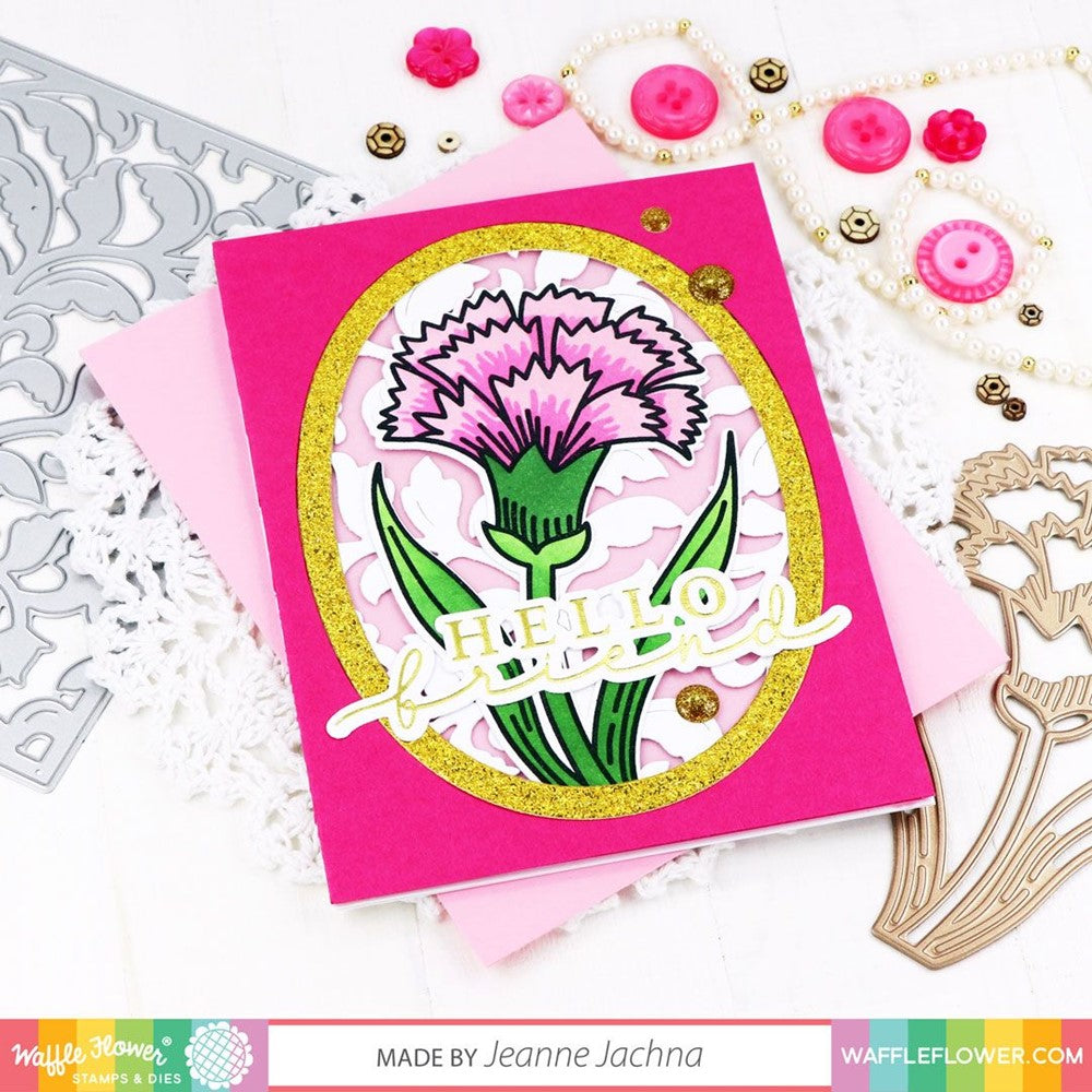 This Sketched Carnation set is the second installment created from the original sketches by Susan Bates for StitchableCards Birth Month Flower cross-stitch patterns. This classy design features bold outlines and elegant curves that are strong enough to be the focal point of your card. Check out the bundle that includes the stamp, matching die, coloring stencil, and the foil plate version of this flower.