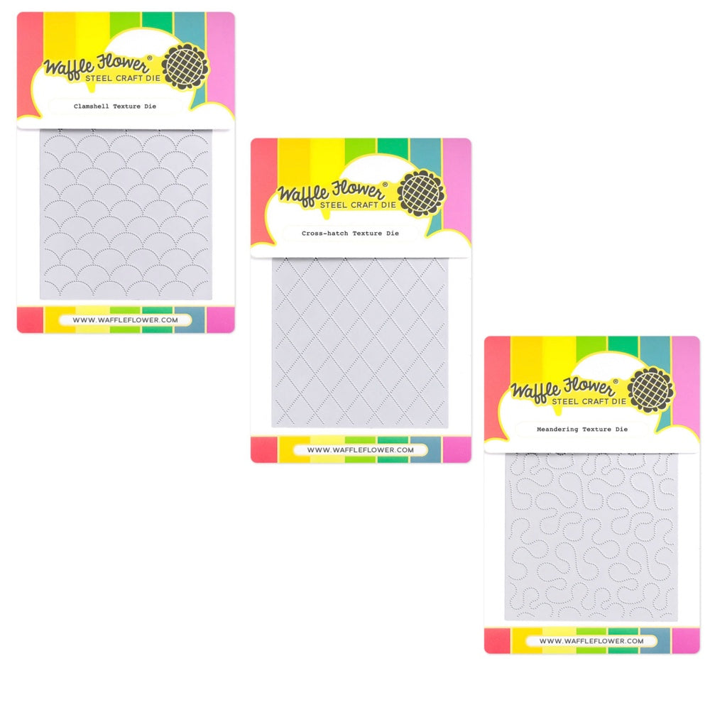 The Waffle Flower Texture Die Set includes three A2-sized piercing dies inspired by classic quilting patterns. This bundle features the Clamshell Texture Die 422049, Cross-Hatch Texture Die 422047, and Meandering Texture Die 422048, each designed to add subtle stitched detail to your projects without cutting the edges. Use them on plain cardstock for an elegant finish or layer them over stenciled backgrounds for added depth. With no outer cutting edge, these dies offer flexible placement and are perfect for cardmaking, journaling, and mixed media. Compatible with most leading die-cutting machines.