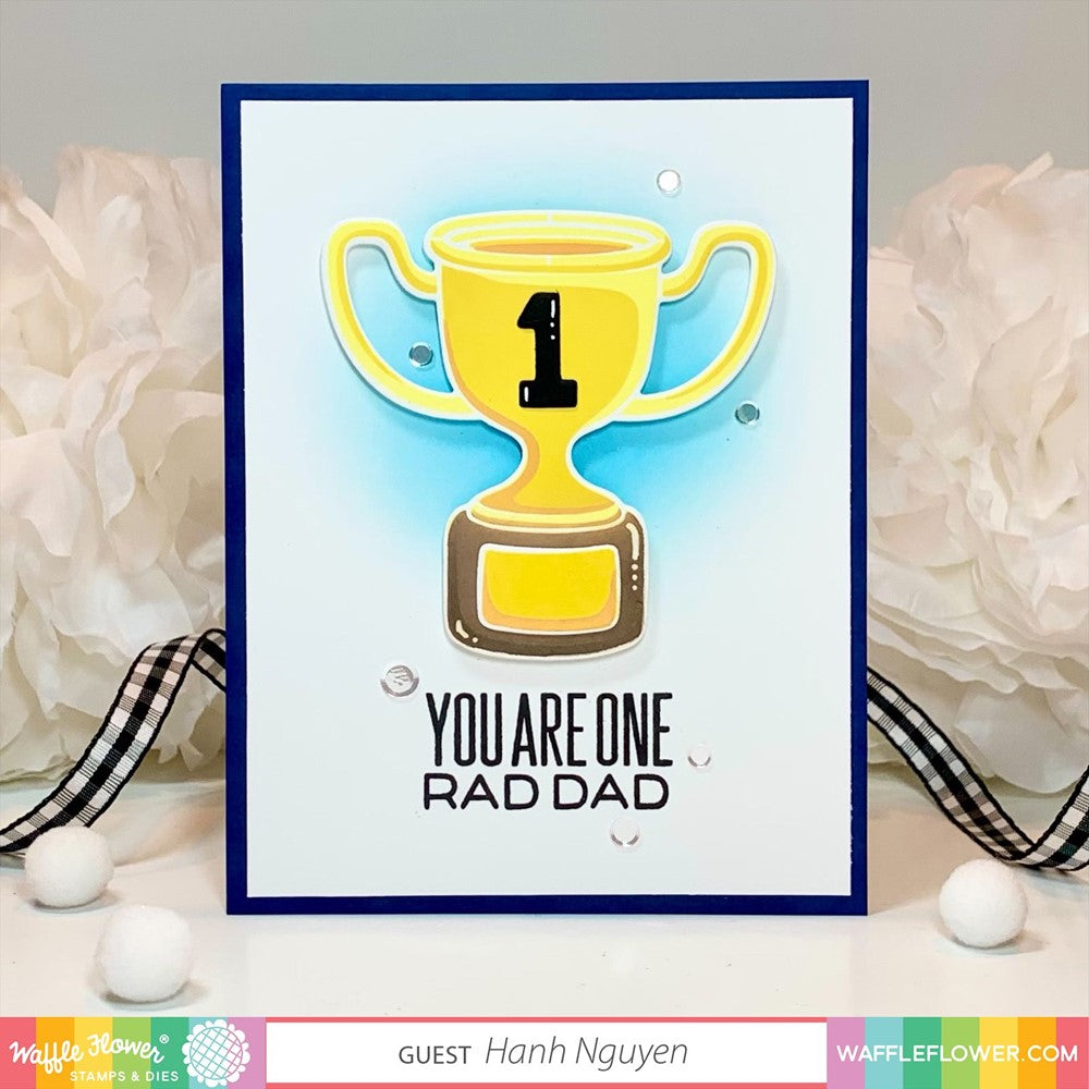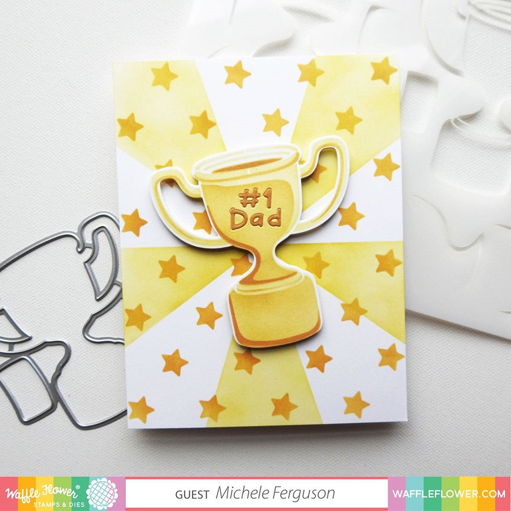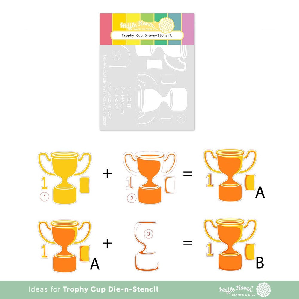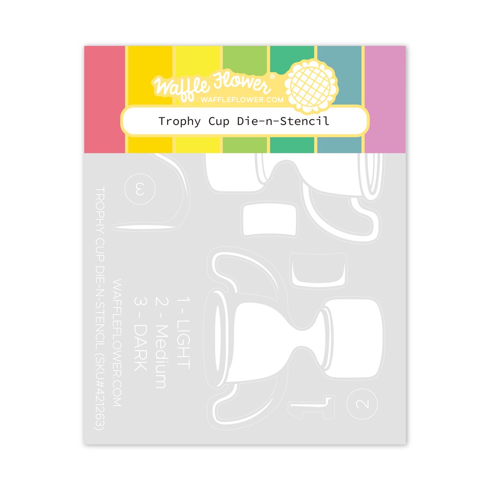The stencil contains 3 layers to create a colorful trophy cup design quickly. Guides are etched on the stencil. Use the included matching die to cut out all the elements at once.