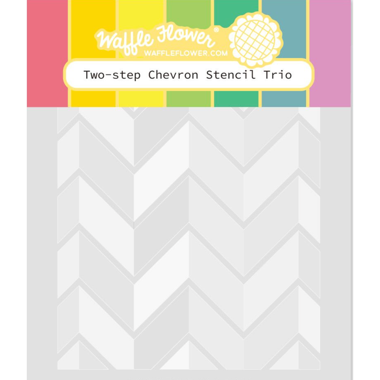 The Waffle Flower Two-step Chevron Stencil Trio is a set that includes three sheets of stencils, each requiring two steps (either flip the stencil or move it up and down) to create a full chevron pattern in multiple colors. For more detailed instructions, please refer to the Idea Sheet and video.