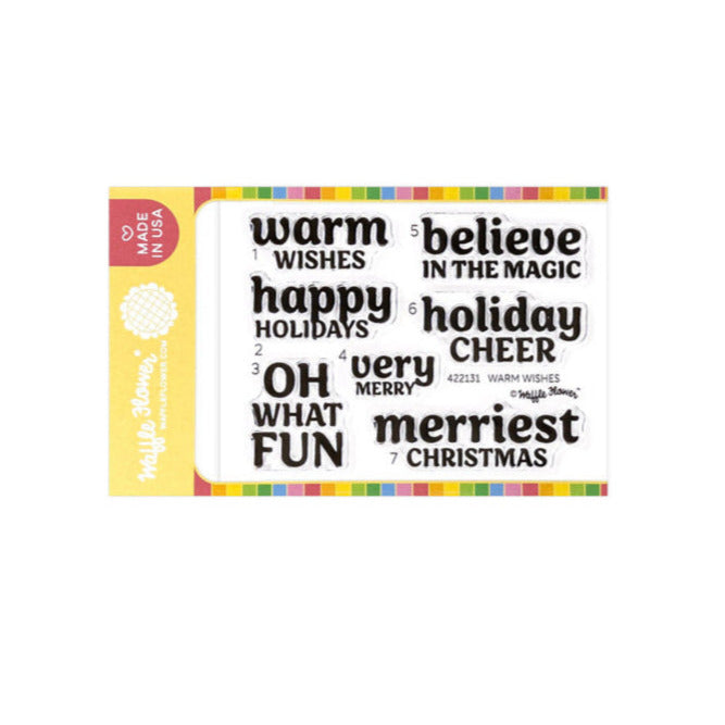 Waffle Flower Warm Wishes Clear Stamps is a 3x4 inch clear stamp set featuring 7 bold and playful sentiments that suit a variety of styles. Each sentiment is numbered to coordinate with the matching Warm Wishes Piercing Matching Dies 422132, sold separately, which add a decorative pierced border for a polished finish. The dies pair beautifully with Waffle Flower’s Piercing Textures and Layering dies for added dimension.