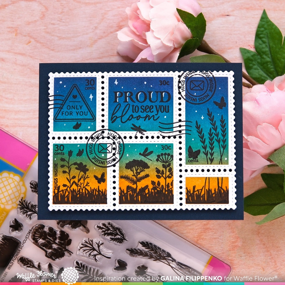 Introducing the Waffle Flower Wild Flower Silhouettes Clear Stamps, a delightful set designed with the beauty of spring in mind. These stamps are perfectly compatible with all versions of Waffle Flower's Postage Collage dies, including A2, A6, A7, Slimline, and Mini Slimline.