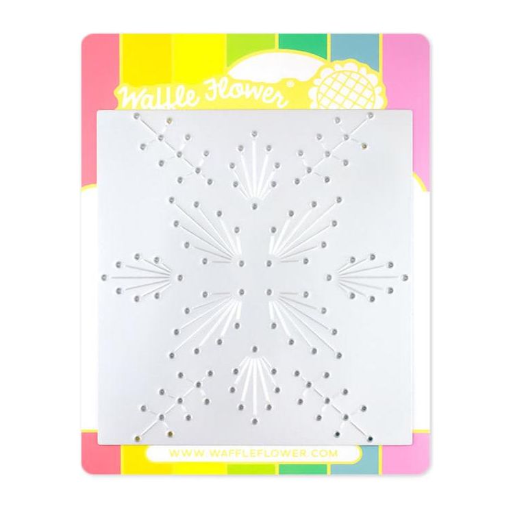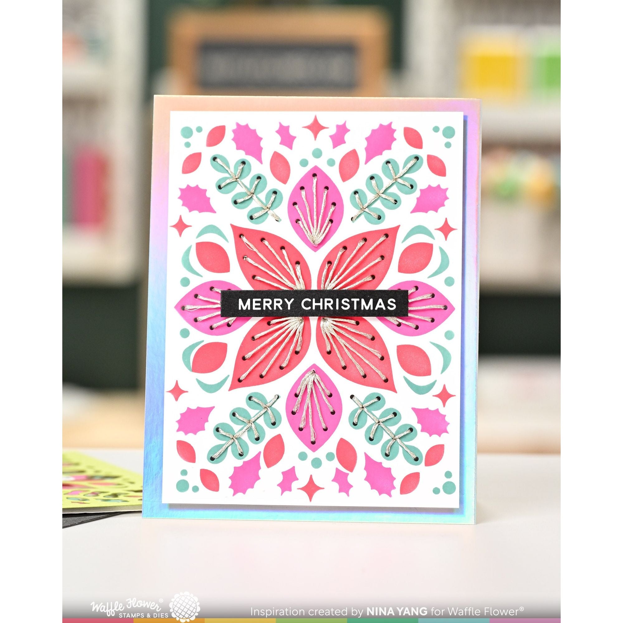 To use the Waffle Flower Winter Floral stitching die with the stencil, first, trim your cardstock to 4.25 x 5.5 inches, and die cut the stitching holes in the center. Instead of aligning your stencil using the etched rectangles, align the openings on the stencils to the die-cut holes. Even if you are a little off on the alignments, don’t worry, it will still look great in the end.