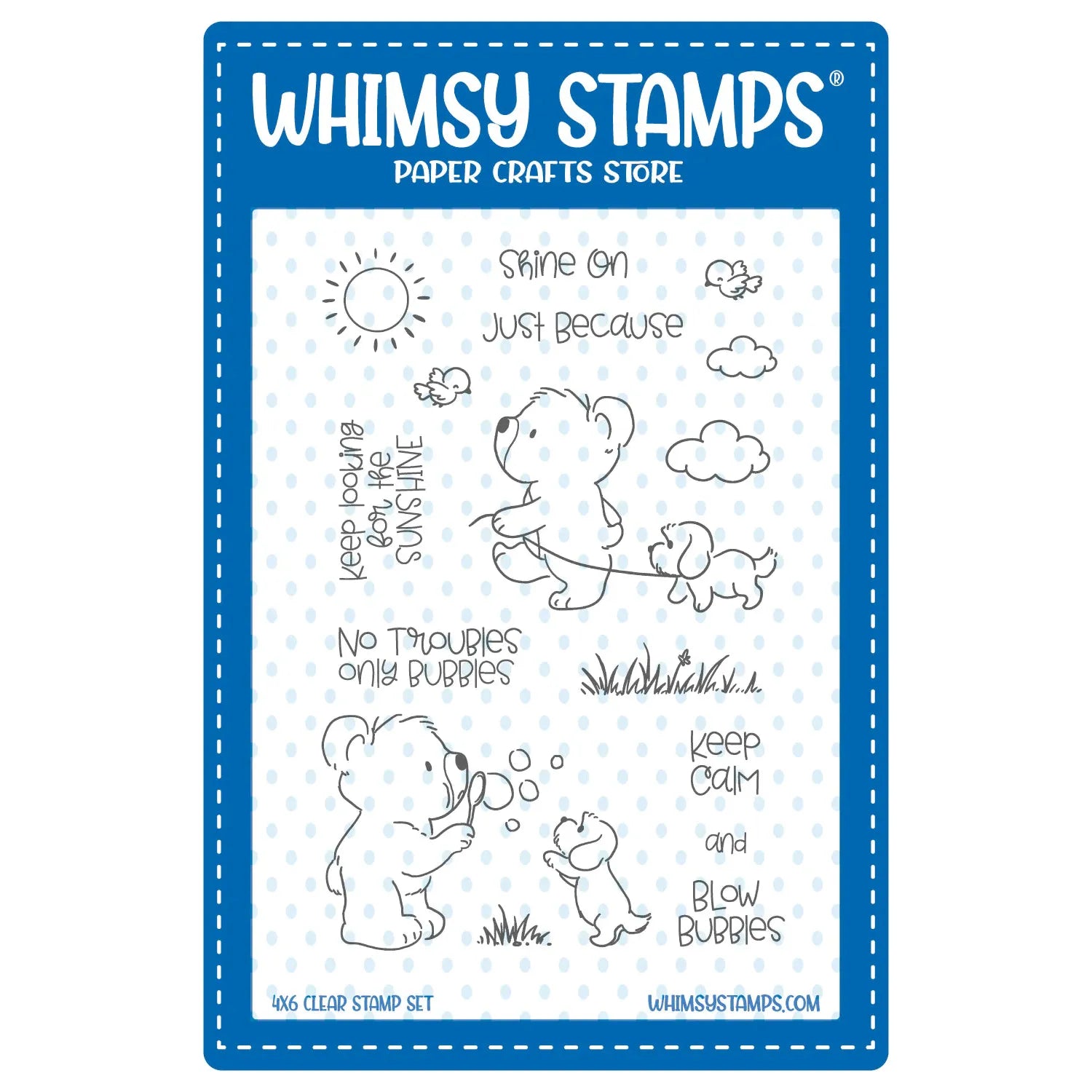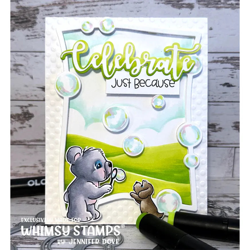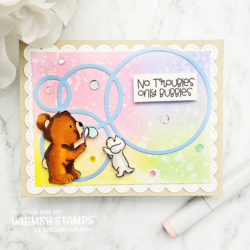 The Whimsy Stamps Bear Bubbles Clear Stamps is a 4 x 6 inch photopolymer stamp set featuring two adorable scene stamps—one with a bear blowing bubbles with his puppy and the other with a bear taking his pup for a walk. This set also includes landscape and accent stamps to help you build your own charming scene, along with seven heartfelt sentiments to complete your designs.