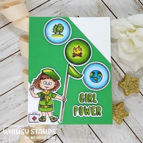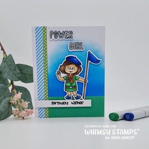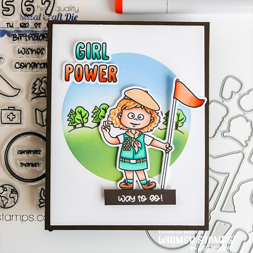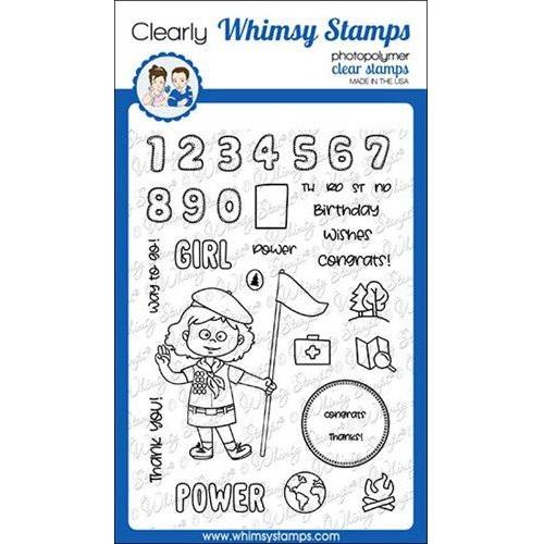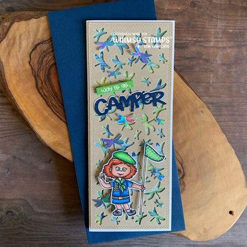 Clearly Whimsy Stamps Collection Happy Camper Girl clear stamp set designed by Deb Davis Amped2Stamp for Whimsy Stamps. This adorable camping themed set is perfect for your little scout or to share summer memories. Includes birthday, thanks, and congratulatory sentiments along with multiple coordinating images to commemorate those camping adventures. Coordinates with the Happy Camper Girl Outline Dies, sold separately. And for more fun pair with the Happy Camper Boy clear stamp set or Happy Camper Die Set, each sold separately.