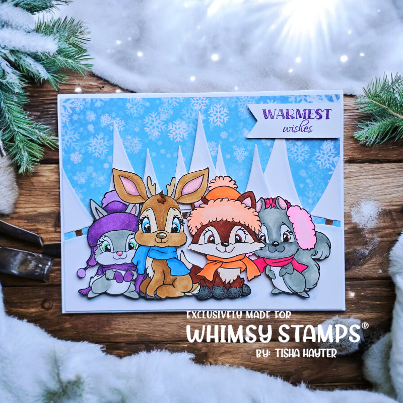 The Whimsy Stamps Christmas in the Woods Clear Stamps and Outline Dies Set is a delightful addition to your holiday crafting collection. Designed by Crissy Armstrong for Whimsy Stamps, the clear stamp set includes four charming critters in winter gear—a deer, rabbit, squirrel, and fox. The set also features 10 wintery sentiments and a delicate snowflake accessory. This is a 4 x 6 inch clear stamp set. This set also includes the Christmas in the Woods coordinating dies!