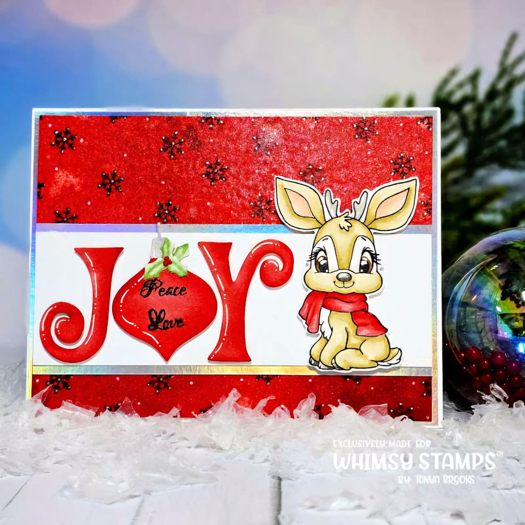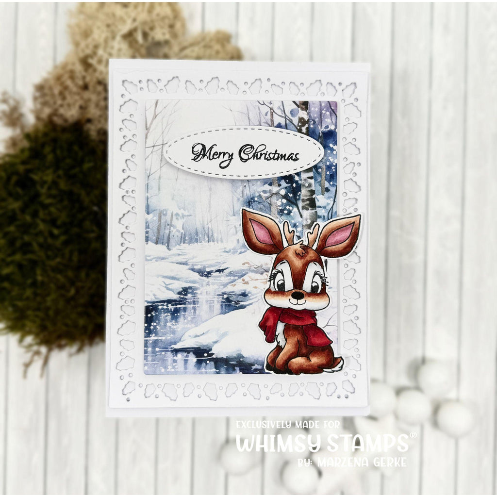 The Whimsy Stamps Christmas in the Woods clear stamp set, designed by Crissy Armstrong for Whimsy Stamps, features four adorable critters in their winter gear ready for snow. The set includes a deer, rabbit, squirrel, and fox, along with 10 wintery sentiments and a delicate snowflake accessory. It coordinates with the Christmas in the Woods Outline Die Set, which is sold separately.