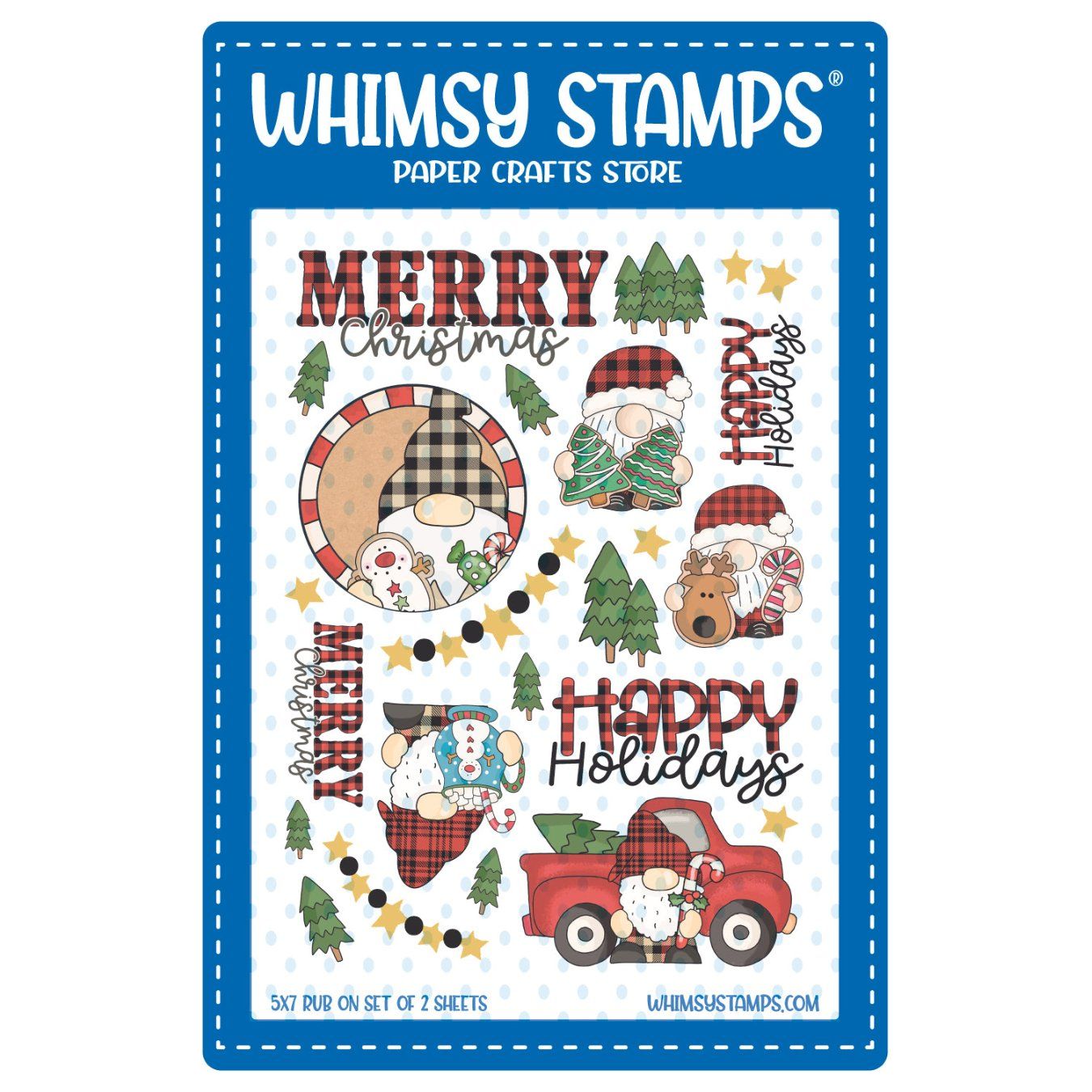 The Whimsy Stamps Country Gnome Rub Ons set includes two identical 5x7 inch sheets of image transfers, perfect for adding a charming country touch to your crafting projects with ease.
