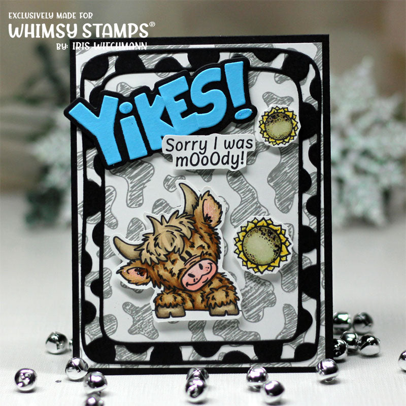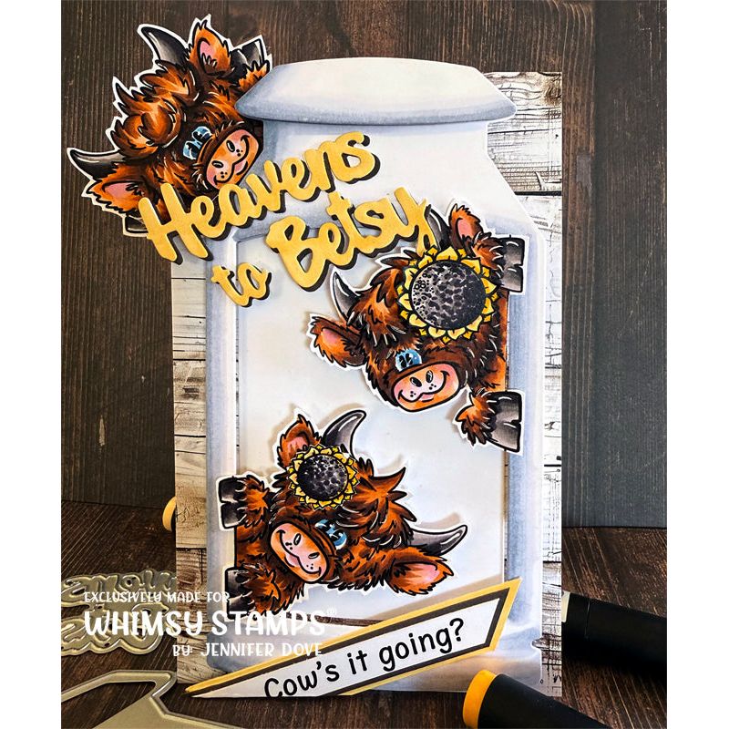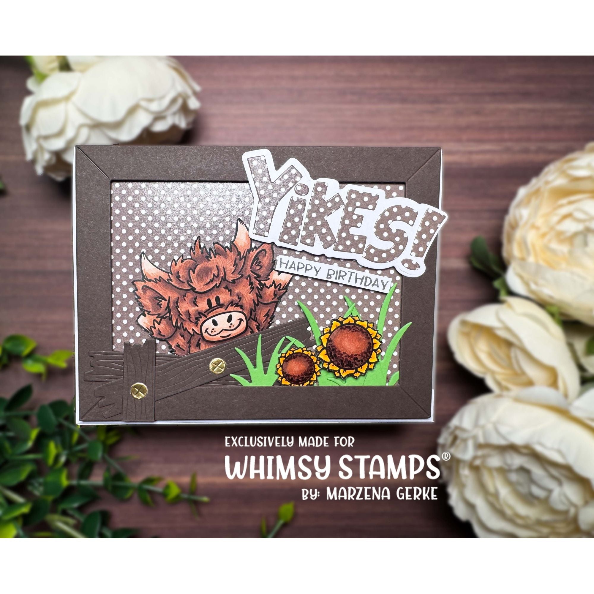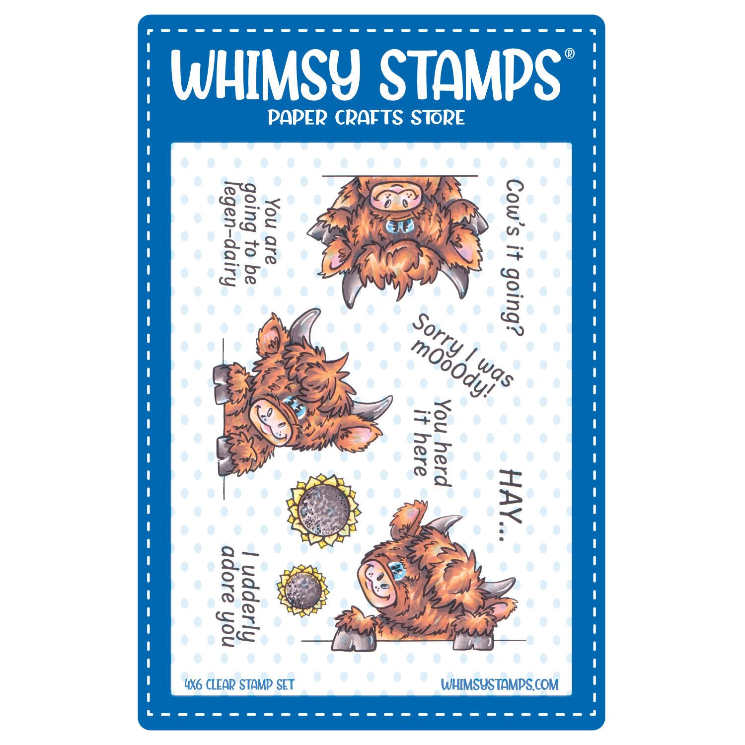 The Whimsy Stamps Cow Crazy Clear Stamps, illustrated by Dustin Pike, bring whimsical charm to your crafting projects. This high-quality 4.0 x 6.0 inch photopolymer stamp set includes three adorable cows peeking over edge lines and six coordinating sentiments, perfect for creating playful and creative designs.