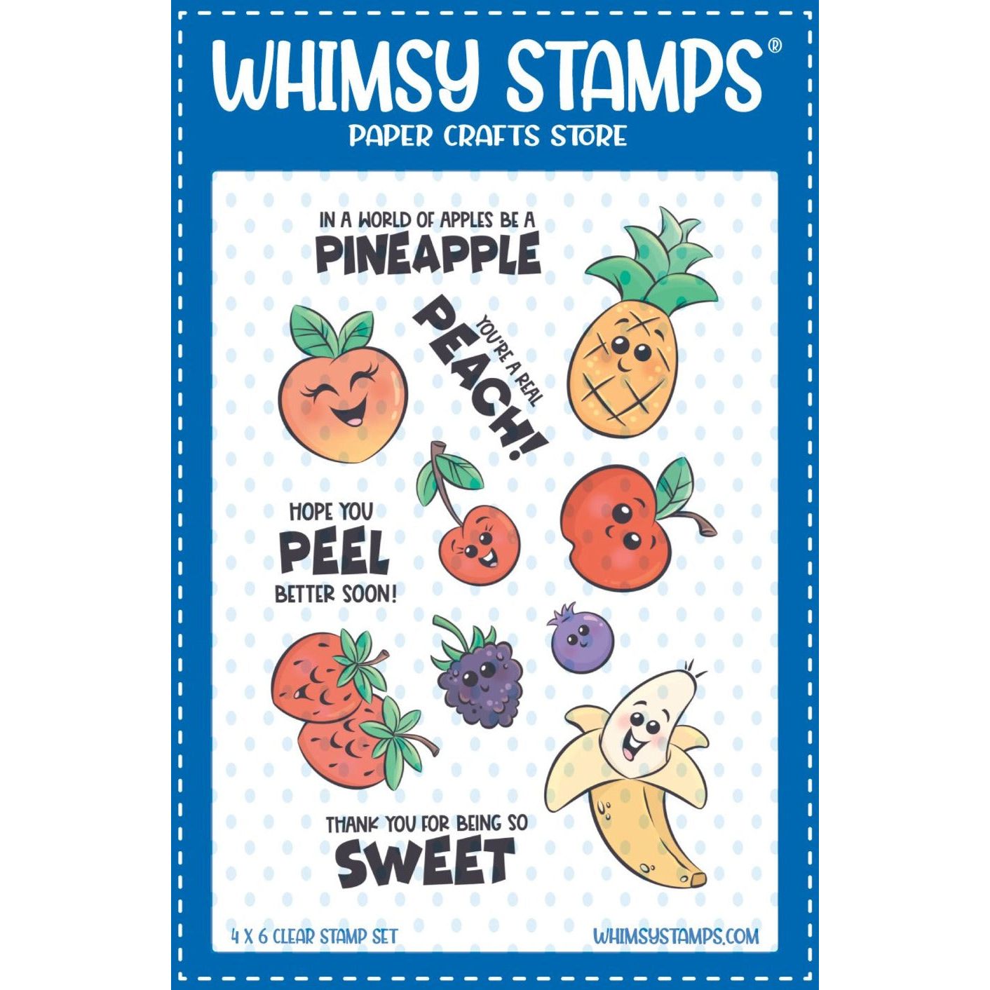 This set features a variety of fruit-themed images, including a pineapple, banana, apple, berries, cherries, and peaches. Additionally, it includes a selection of fun sentiments to complement your fruity creations.