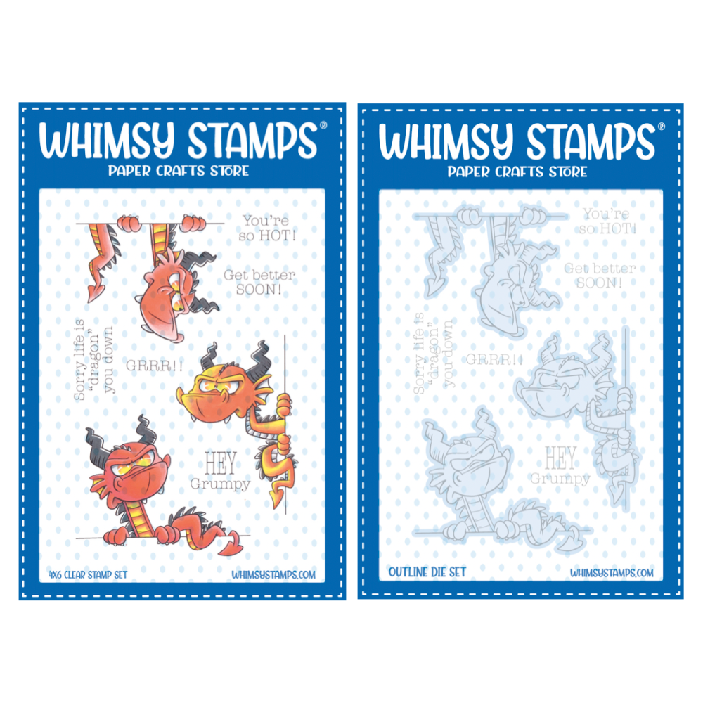 The Whimsy Stamps Grumpy Dragons Clear Stamp DP1006a and Die WSD284 Set combines both the Grumpy Dragons Clear Stamps and the Grumpy Dragons Outline Die Set. This set features: