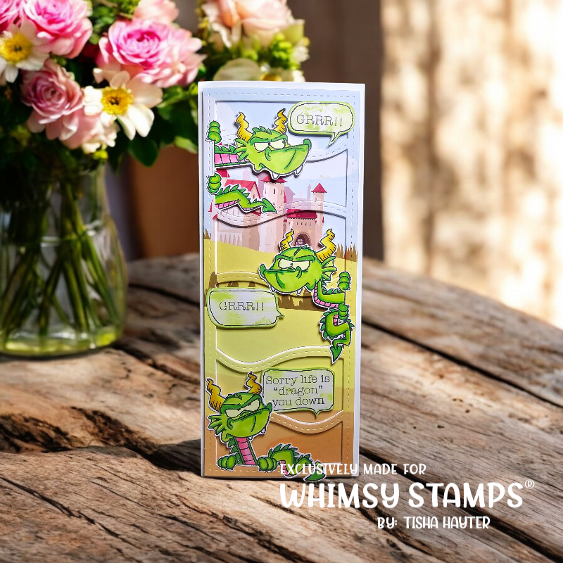 The Whimsy Stamps Grumpy Dragons Clear Stamps, illustrated by Dustin Pike for Whimsy Stamps, is a 4x6 inch clear stamp set featuring three different grumpy dragons and five humorous sentiments. This set coordinates with the Grumpy Dragons Outline Die Set WSD284 sold separately.