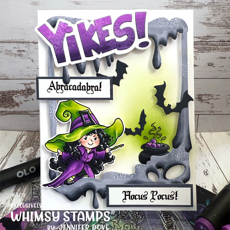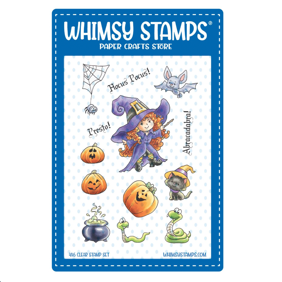 The Halloween Tricks Clear Stamps from Whimsy Stamps is a 4 x 6 inch set designed by Crissy Armstrong. Brew up some creepy-cute Halloween fun with this witch-themed collection, packed with delightfully spooky images, including a sweet witch, jack-o’-lanterns, a mischievous cat, slithering snakes, a bat, spider, a web, and a bubbling cauldron. Perfect for building enchanting Halloween scenes on your cards, scrapbook pages, and tags. Coordinates with the Halloween Tricks NoFuss Masks WSNFM52, sold separately.